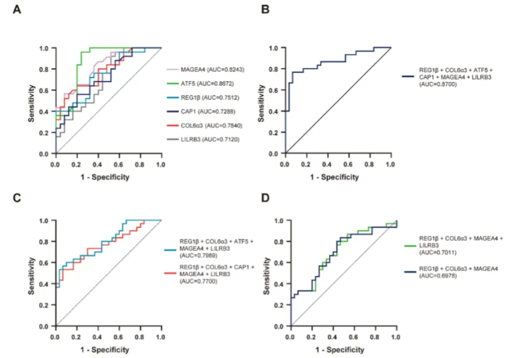 图6.基于ROC分析候选血浆蛋白及其组合对IDD进展预测效能