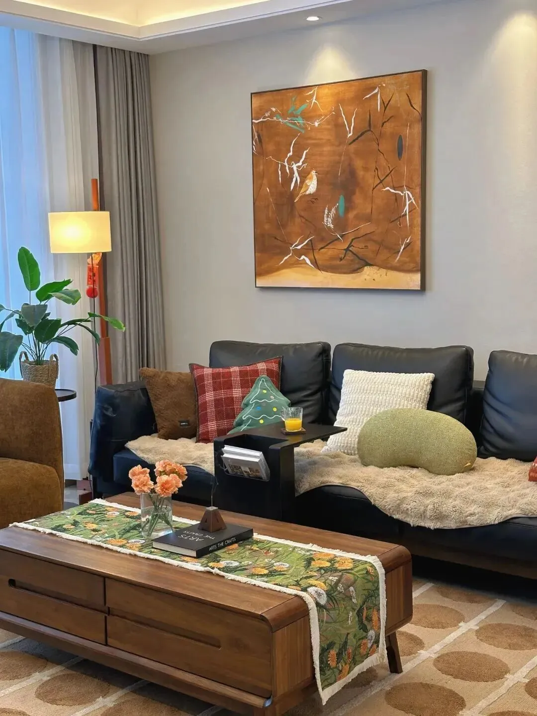 茶几上铺着一条有花草图案的桌旗,旁边是一只陶瓷花瓶,插着新鲜的橙色花朵。