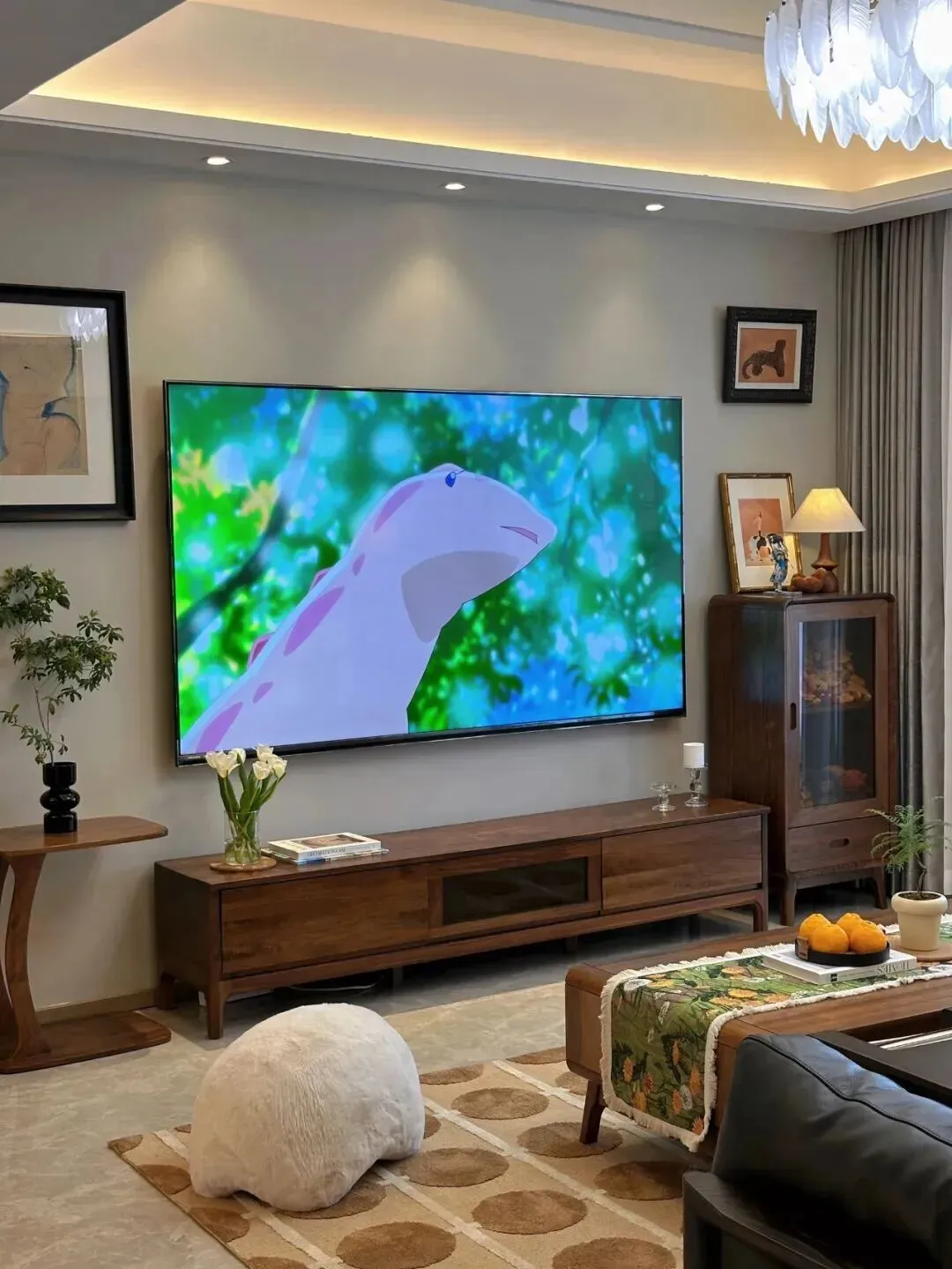 整个客厅以木色和米色为主调,电视柜和茶几都选择了温润的实木材质,坐在沙发上时,能感受到那种温暖的木纹触感。