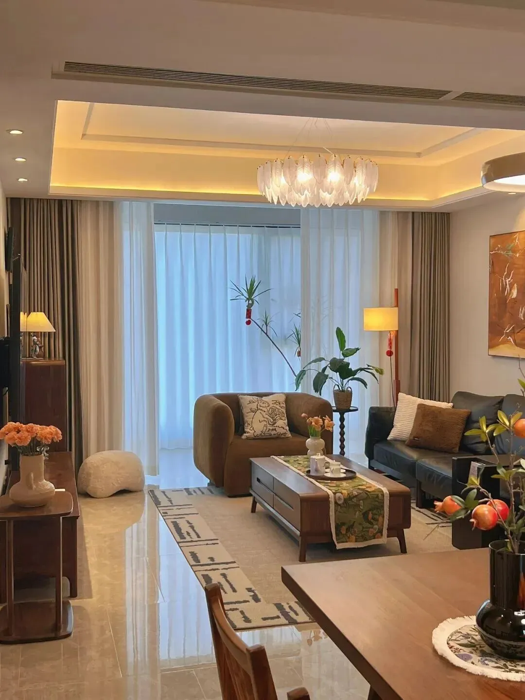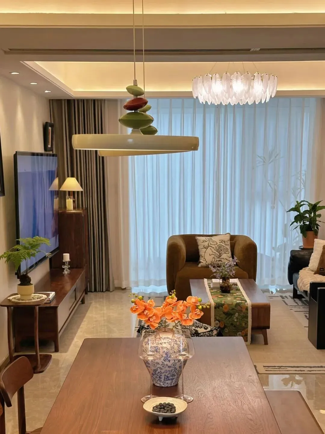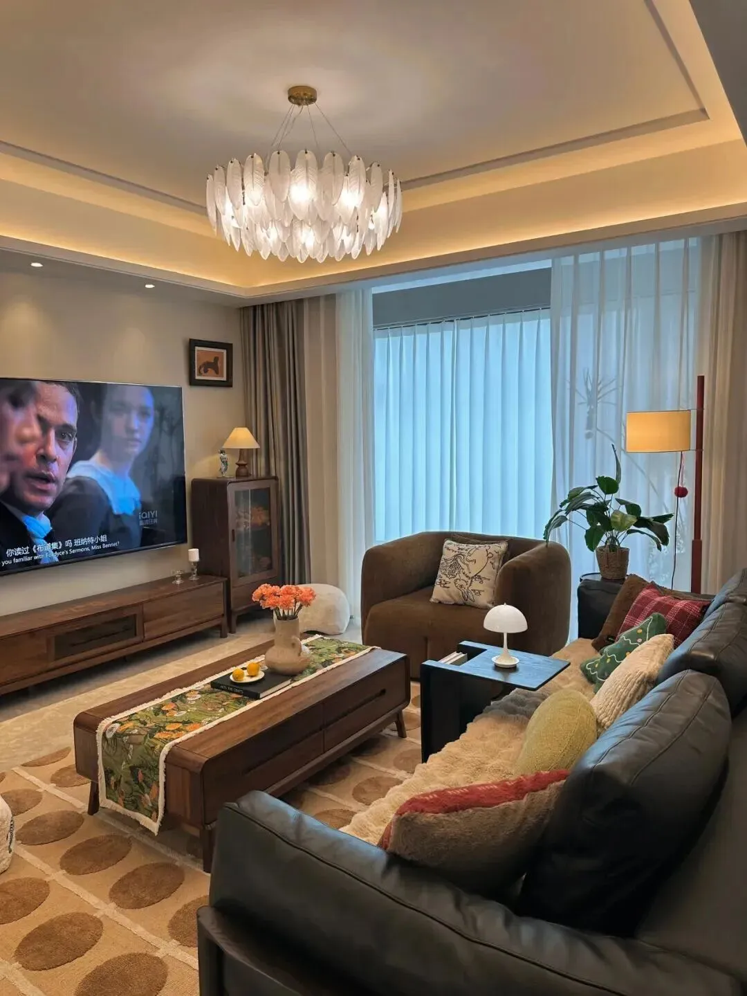 主灯用的是羽毛状的吊灯,配合天花板的隐藏灯带,晚上开灯以后,整个客厅都变得很有层次感,既柔和又不会刺眼。