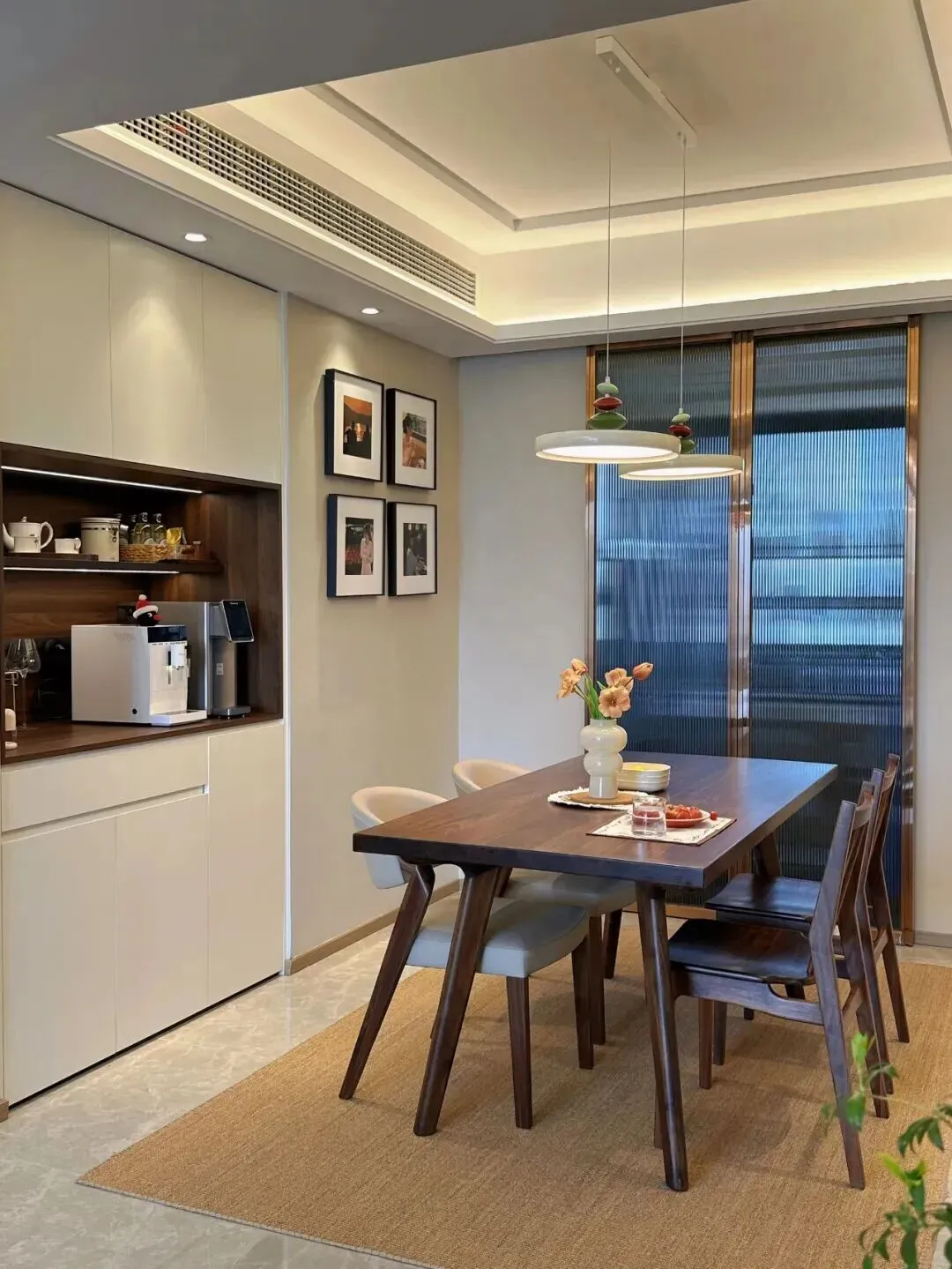 柜体上方摆放着咖啡机和一些小摆件,墙上几幅留白的照片画框,让进门的这一角多了些生活的温度。