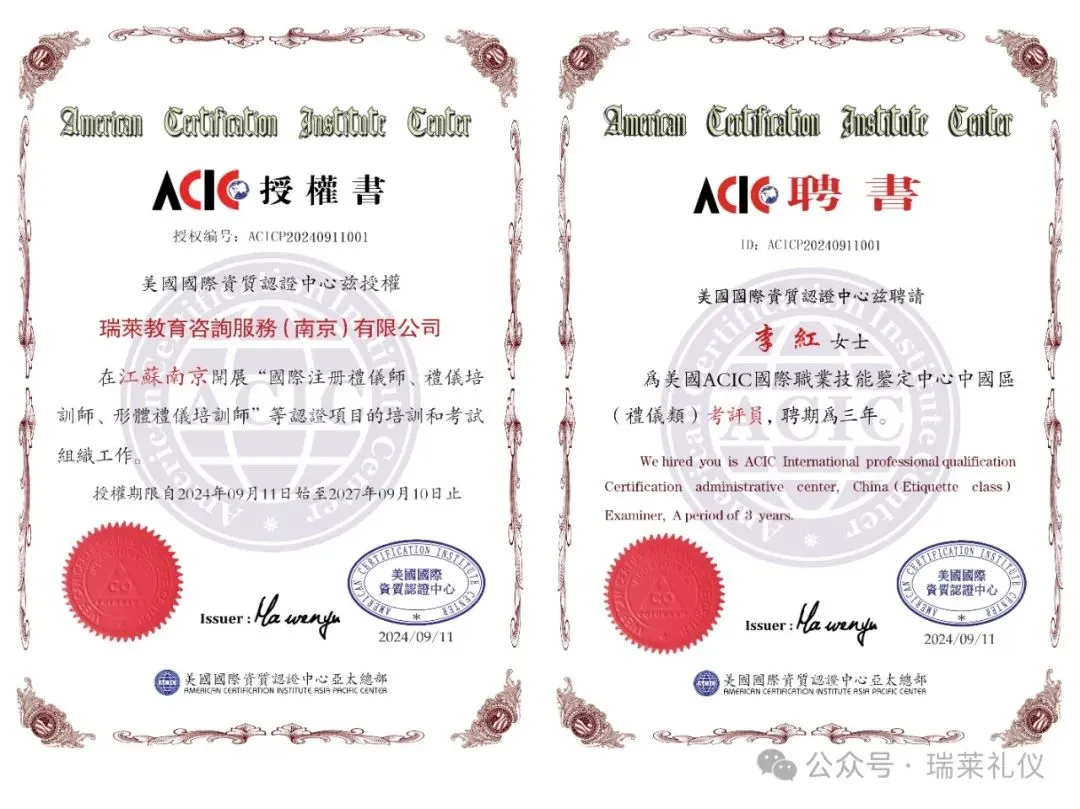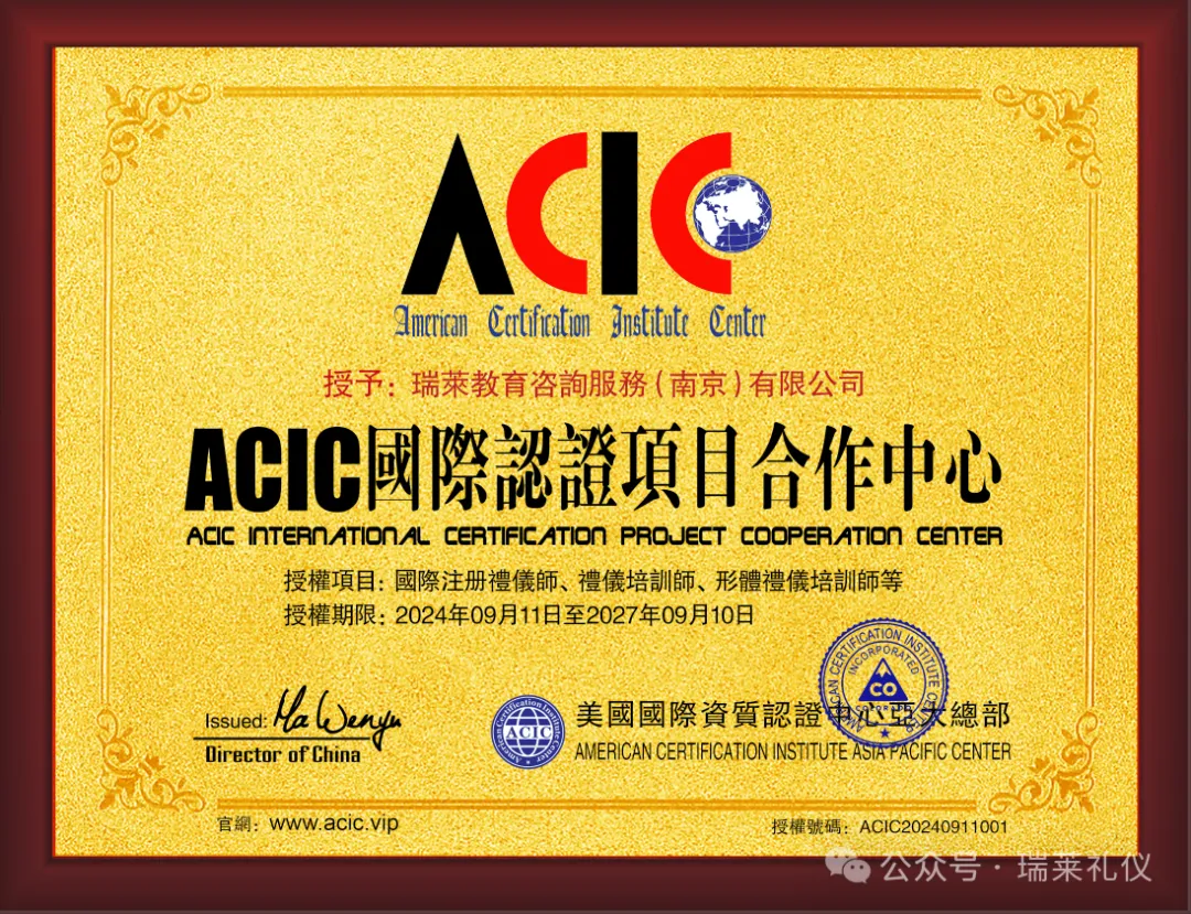 瑞莱礼仪与ACIC国际认证和中国成人教育协会合作推出的《国际注册高级礼仪培训师双证班》,国内国际权威认证。培训新一代礼仪精英,打造终生成长平台,以技能成长为核心,输送全国至海外。