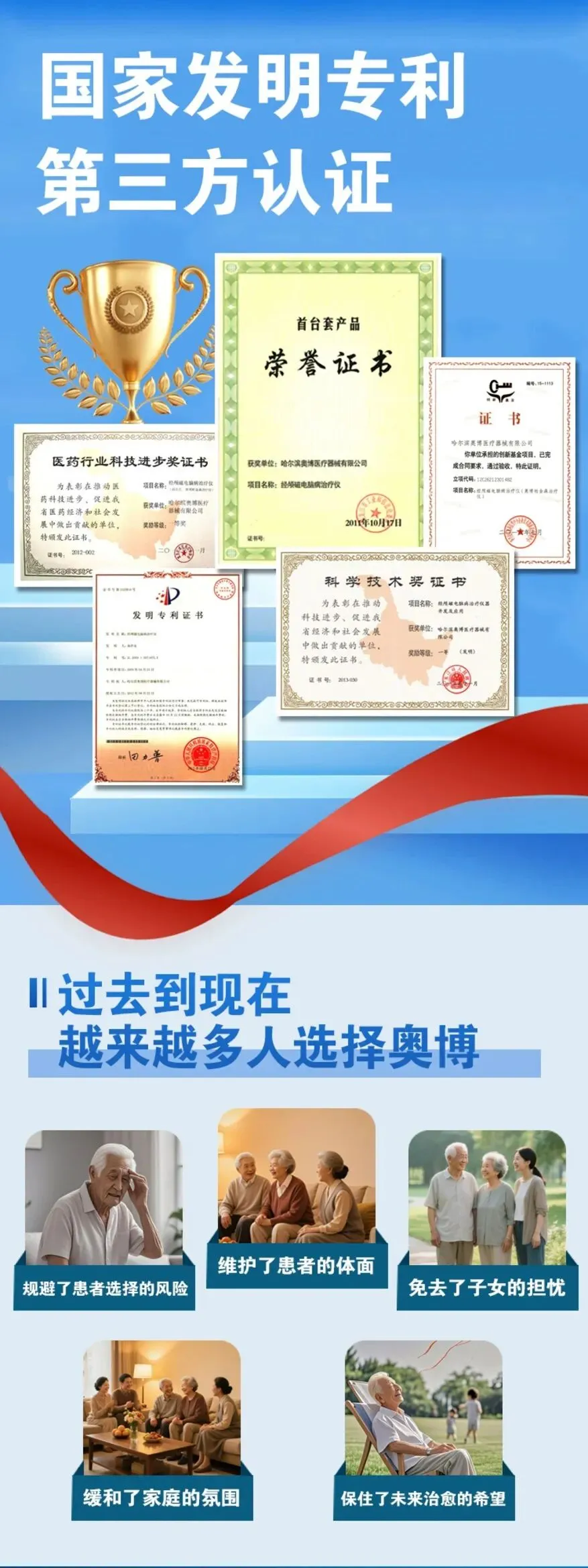 奥博帕金森治疗仪(又称“经颅磁电脑部刺激仪”)已通过国家药品监督管理局审批注册,生产企业为哈尔滨奥博医疗器械有限公司,持有合法的医疗器械生产许可证。产品适用范围明确为:轻、中度帕金森病的辅助治疗,对震颤、僵直、运动迟缓等症状具有改善作用。用户可通过国家药监局官网输入注册证号查询验证,这是判断医疗器械真伪的最权威方式。