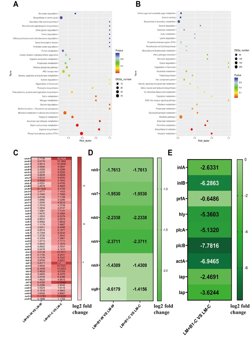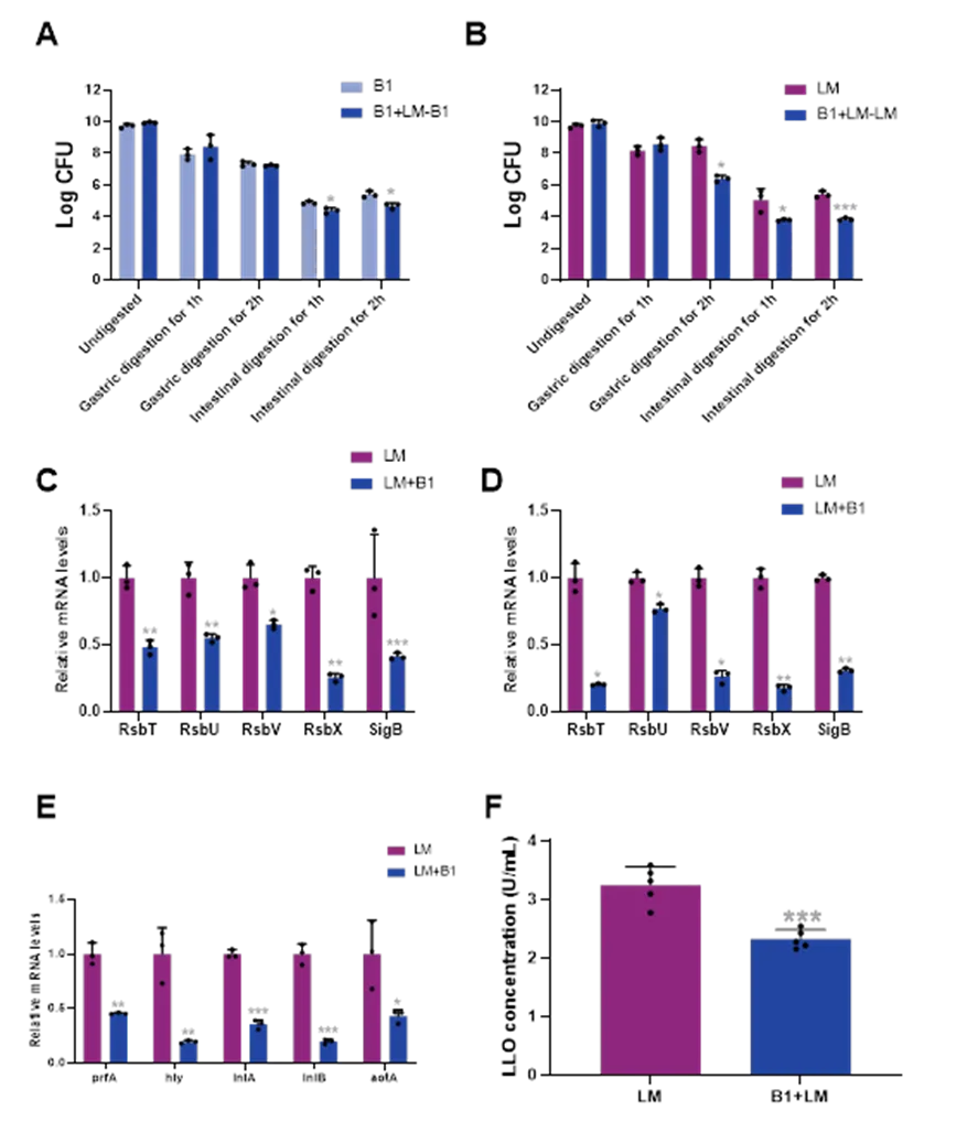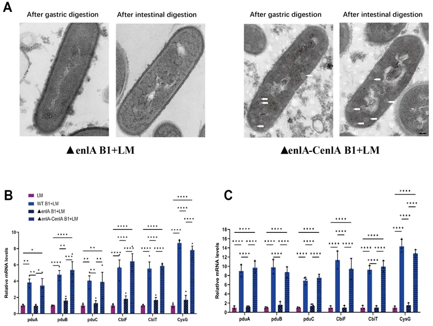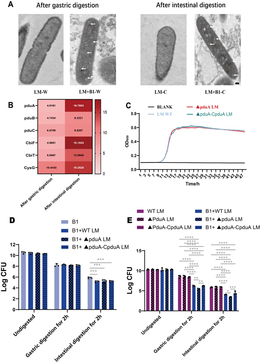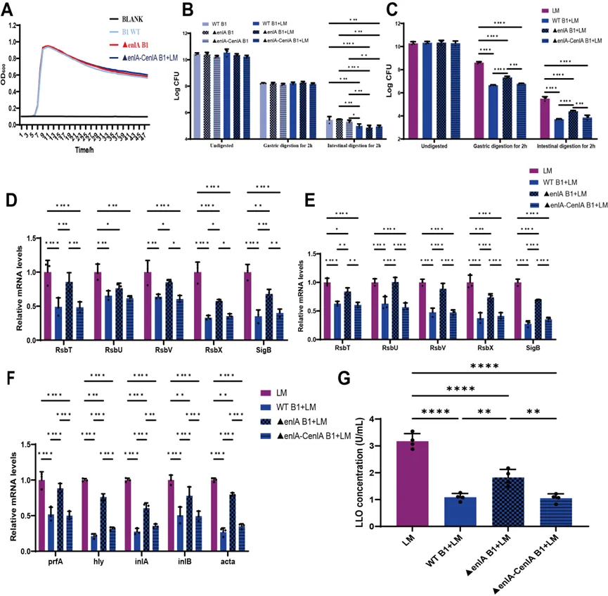 屎肠球菌B1可减轻小鼠单增李斯特菌感染引起的体重下降、降低肝脏、脾脏及肠道组织中的菌载量,并缓解空肠炎症反应。进一步的,在体外模拟胃肠道消化条件下,屎肠球菌B1可显著抑制单增李斯特菌存活,降低其sigB相关应激响应及多种毒力基因表达。值得注意的是,单增李斯特菌在屎肠球菌B1拮抗压力下会形成细菌微室,以增强其在胃肠道环境中的适应能力。同时,屎肠球菌B1中的enlA基因在抑制单增李斯特菌及诱导其细菌微室形成过程中发挥关键作用。该研究揭示了乳酸菌与食源性病原菌在胃肠环境中的互作新机制,为发酵食品安全控制及功能菌株开发提供了新的理论依据。