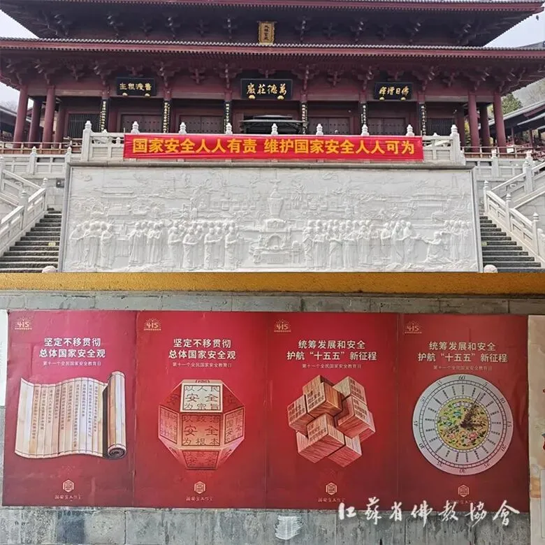 活动中,南京市佛教协会以“制度规范年”为契机,结合“学法规、守戒律、重修为、树形象”教育活动要求,推动国家安全教育与佛教界自身建设深度融合。栖霞古寺、鸡鸣寺、佛顶寺等寺院通过悬挂主题标语、条幅,制作宣传海报、展板及宣传栏等形式,开展宣传教育;灵谷寺等寺院集中组织教职人员和信众代表观看全民国家安全教育日主题宣传片。