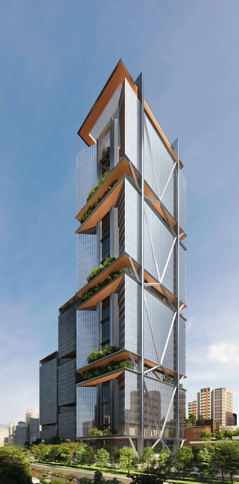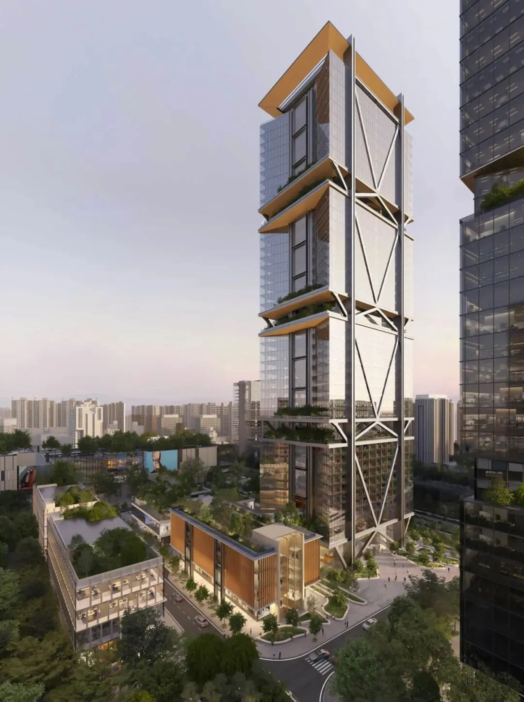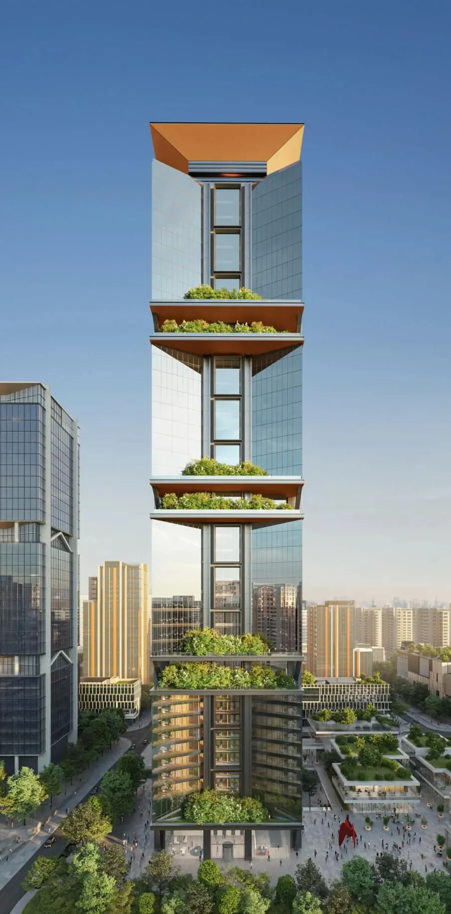 南京裕华是一座200米高的综合用途大楼,包含36层办公空间和9层酒店空间,裙楼为零售商铺。酒店位于大楼顶层,坐拥壮丽的城市景观,并利用内部中庭设计减少楼层进深,引入自然光线。裙楼设有酒店的大型餐饮和会议设施,以及零售商铺,为街景增添活力。方案在构成上由四个堆叠的体量组成,体量之间以凹入式花园层分隔,并以色彩鲜艳的檐底板加以强调。这些视觉上的分割打破了塔楼的垂直尺度,并为建筑使用者提供了生物多样性丰富的屋顶露台。方案呈东西走向,东侧面向新兴商业街,西侧面向贯穿城市的主干道。建筑体量在东西两端进行精细划分,以突出建筑形态,并为东西两侧提供窗户。南北立面采用对角结构支撑,南立面采用水平百叶窗,用于遮挡阳光,减少建筑物的太阳辐射负荷。