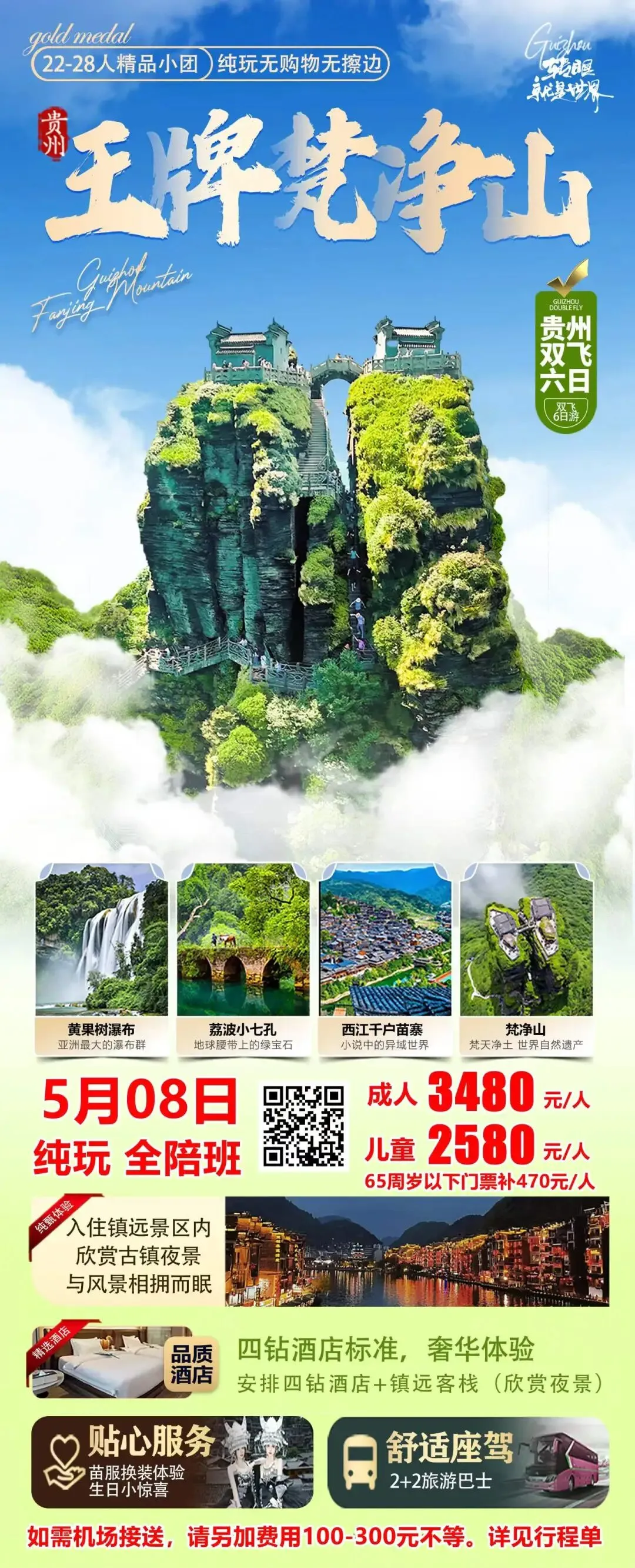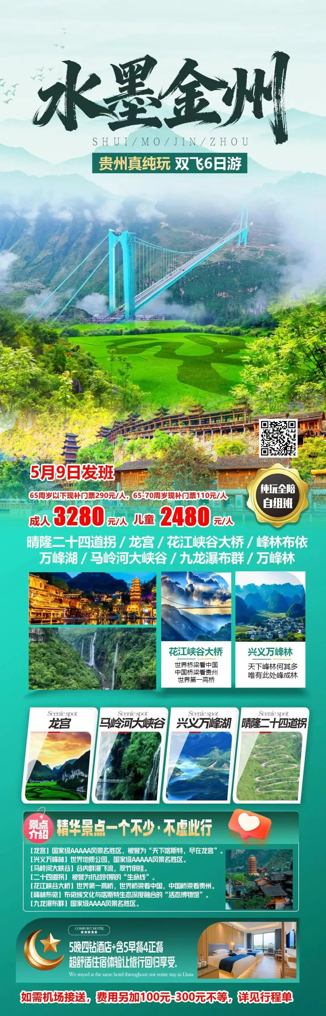 ☘️贵州黔西南,奔赴绿色的快乐 🍀贵州《水墨金州》兴义双飞6日游 ☘️纯玩0购物0擦边,全陪班铁发 🍀精选5晚四钻酒店,诚心满满 ☘️单人放心出游,提供免费拼房服务 🌷国际王牌景区、中国岩溶百科全书——九洞天(4A) 🌷中国最美水溶洞、全国最长最美水溶洞——龙宫(5A) 🌷地球的最美裂缝、七十二瀑落一河——马岭河峡谷(4A) 🌷中国基建狂魔的结晶,世界第一高、长桥——花江峡谷大桥 🌷中国最美的五大峰林之一、中国锥状喀斯特“博物馆”——万峰林(5A) 🌷万峰之湖,山中有水,水中有山——万峰湖(4A) 🌷山水布依、诗意栖居,600余栋布依特色建筑集群——峰林布依(3A) 🌷中国十大最美公路,中国抗战生命线——晴隆二十四道拐(4A) 🌹森呼吸贵州的负氧离子,才懂什么是藏在山水里的人间仙境 |