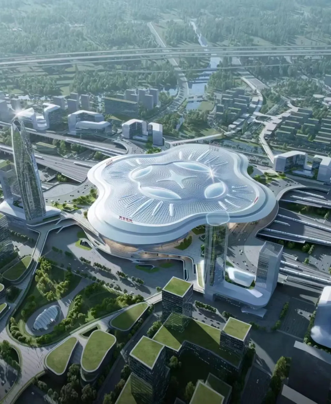 记者注意到,北站以“智汇金陵 科创未来”为设计理念,整体造型融合“原子聚合”与“星云放射”元素,流线型轮廓充满科技感与未来感,建成后将成为南京又一标志性建筑。