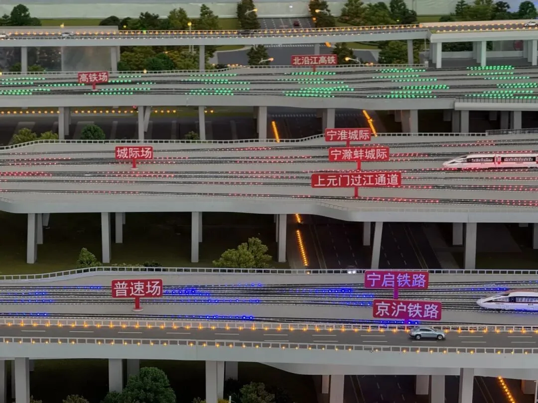南京铁路枢纽(江北地区),位于京沪铁路与沿江通道交汇点,是国家“八纵八横”高铁网的重要组成,由北沿江高铁、宁淮城际、宁滁蚌城际、上元门过江通道、宁启铁路、京沪铁路等多条干线及联络线构成,其建设总投资达641亿元。