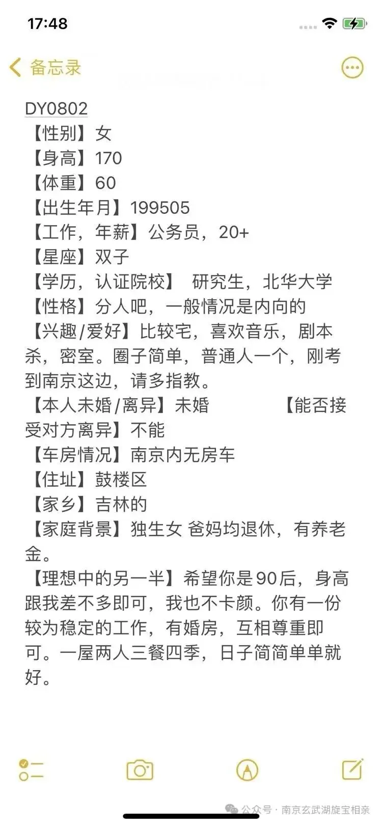 南京相亲丨95年,女,身高170,北华大学研究生学历,公务员工作,年薪20万左右