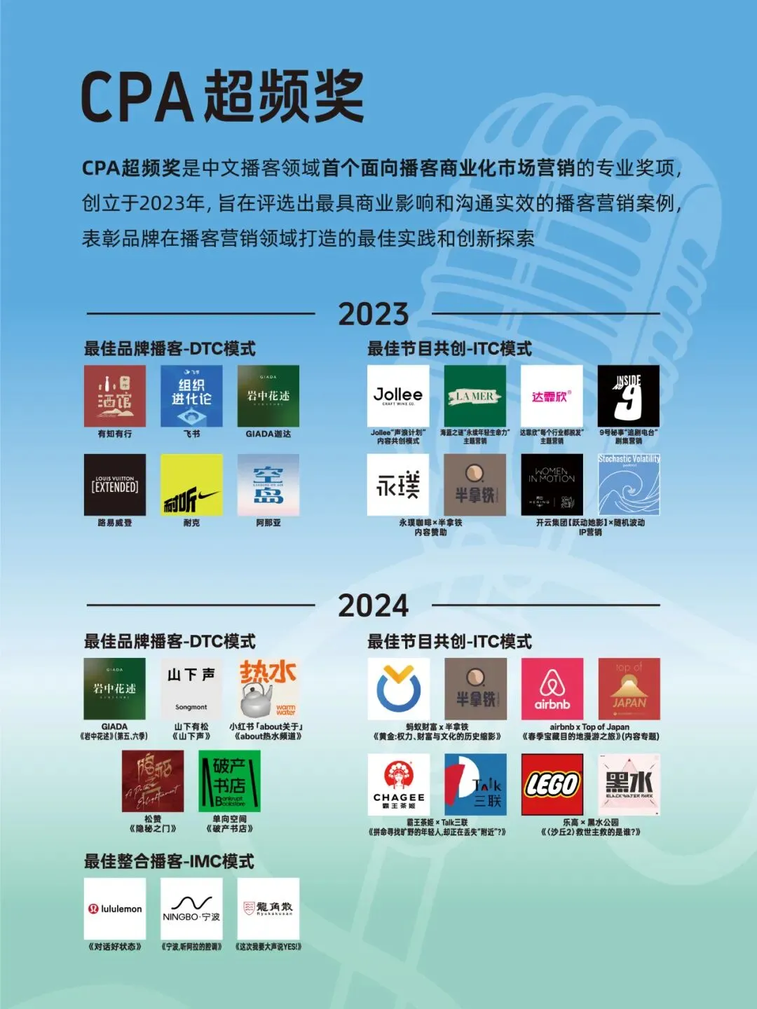 「CPA超频奖」是中文播客领域首个播客商业化的专业奖项,于2023年首次颁发,旨在表彰来自不同行业、不同领域的品牌主和创作者在播客商业领域的创新探索和最佳实践,今年已经进入第三届。