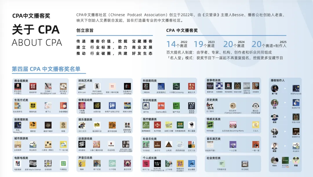 目前,来自品牌主、创作者、播客平台等多重角色的代表仍然可以推荐(包括自荐)2025年的播客营销和商业化案例(添加奖项小助理微信:cpaward),让我们共同期待越来越多的创新实践持续涌现,更多杰出案例被看见、被认可、被借鉴,一齐合力,推动中文播客社区不断壮大、健康成长。