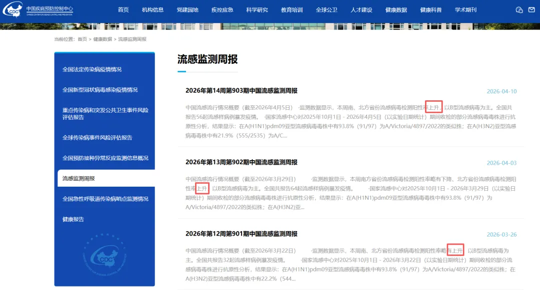 根据中国疾控中心近期发布的全国急性呼吸道传染病哨点监测情况,全国流感病毒检测阳性率连续3周上升。