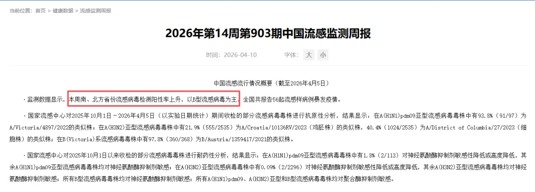2026年3月30日—4月5日,全国哨点医院门急诊流感样病例呼吸道样本检测阳性率前三位病原体为流感病毒(16.3%)、鼻病毒(10.0%)、副流感病毒(6.5%)。其中全国流感病毒检测阳性率有所上升,主要由于B型流感流行导致,北方省份流感病毒检测阳性率高于南方省份,5~14岁病例组高于其他年龄组。