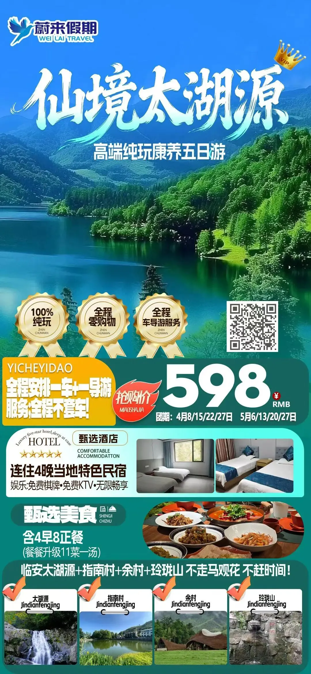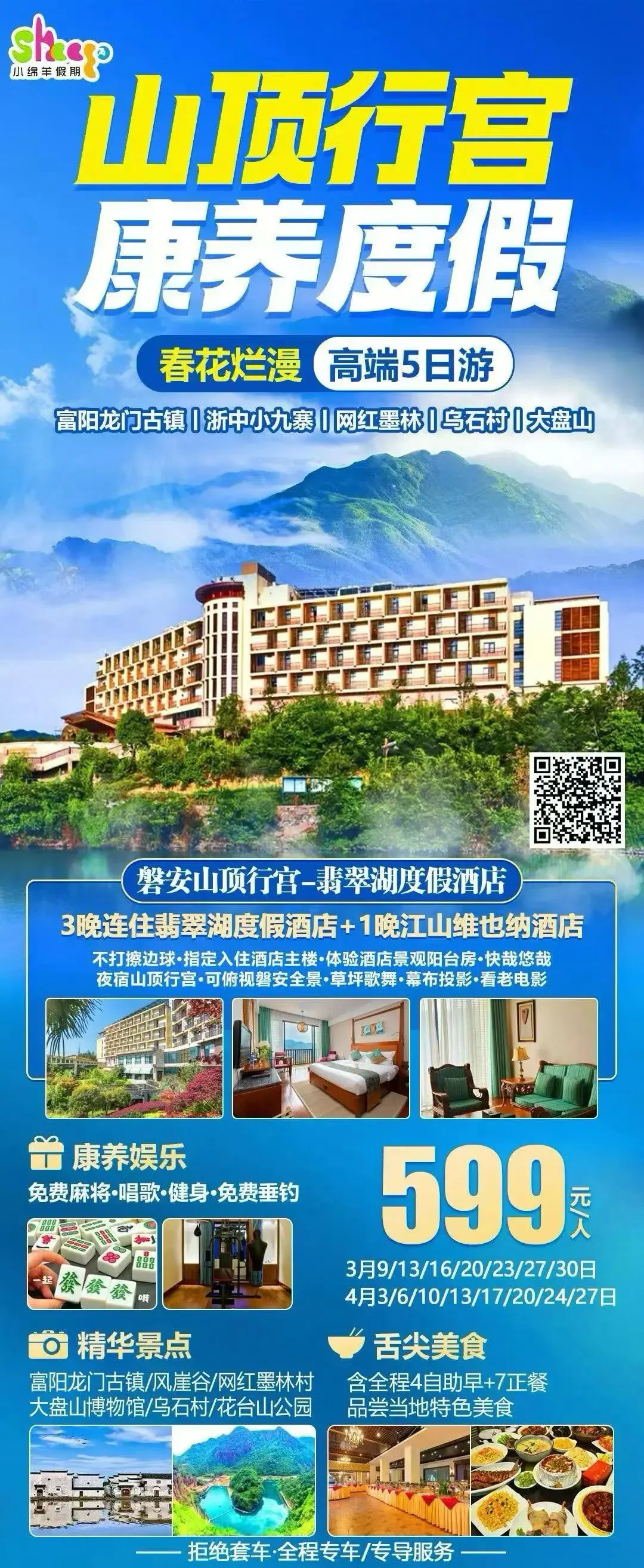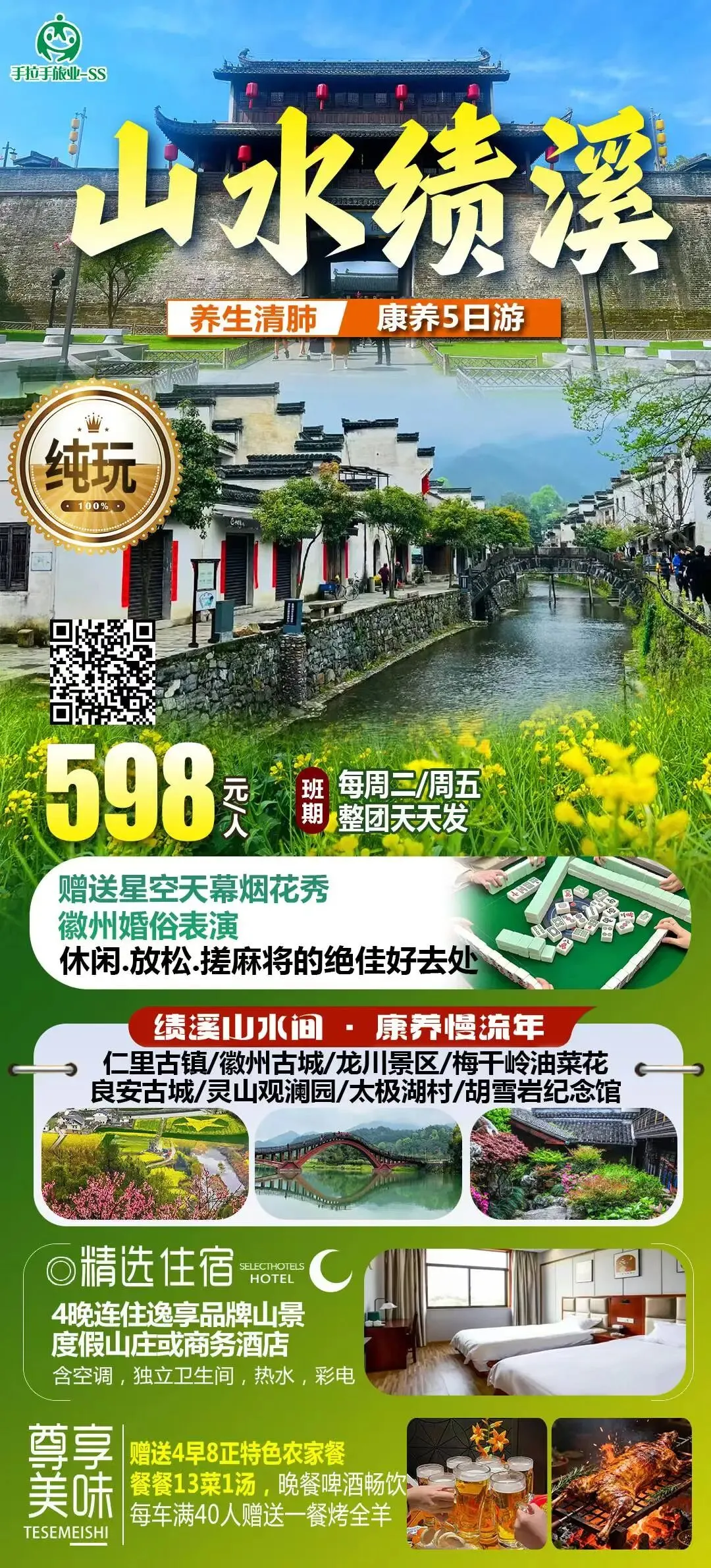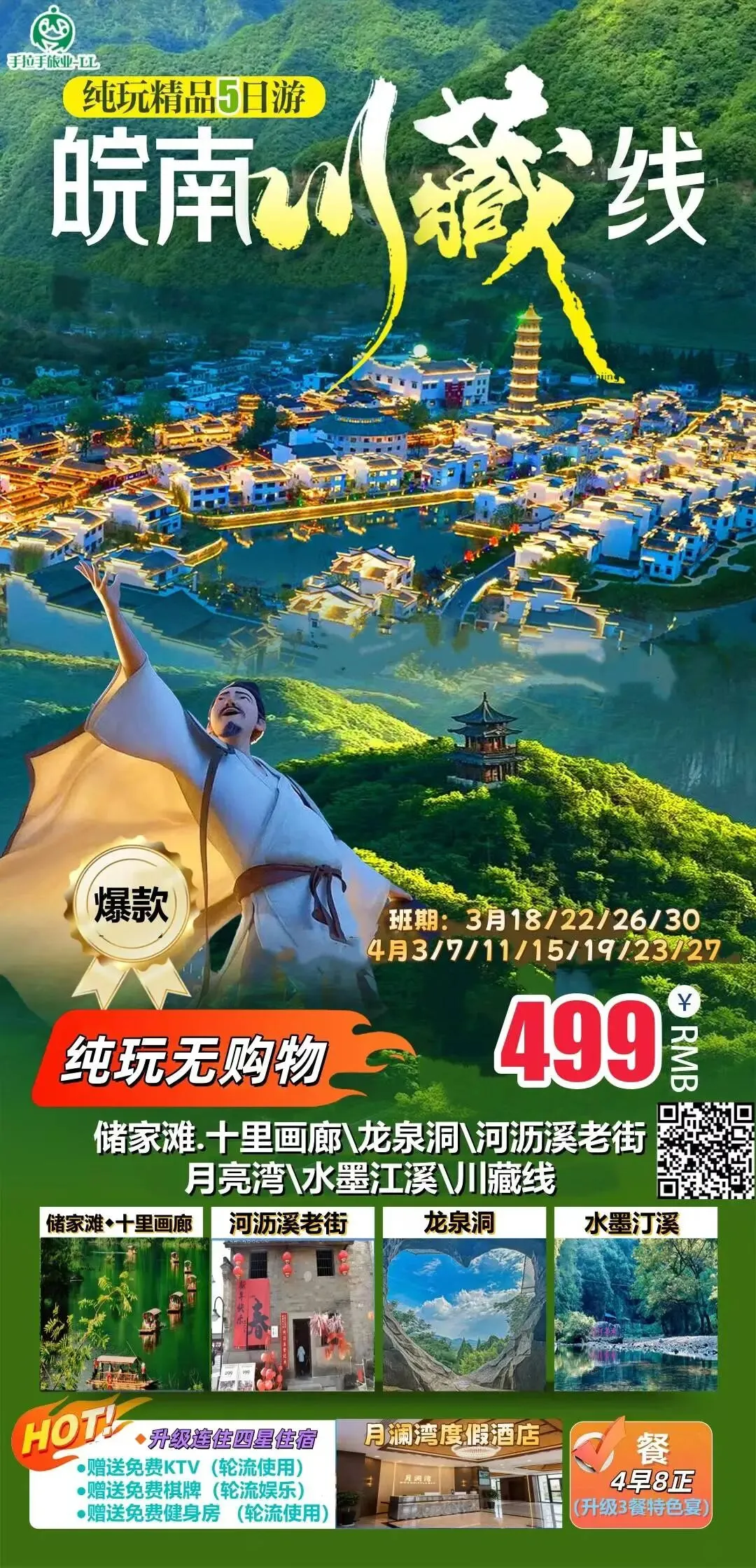 4🈷️17日,铁发,余位34,余位16,单男可拼✔ 4🈷️24日,接近成团,余位22✔ 🌸山水绩溪★康养纯玩5日游 ------------------------ 💰收客价:598+60元 ❤皖浙天路-梅干岭油菜花🔸千年仁里🔸夜游良安古城🔸灵山观澜园🔸徽州古城🔸上庄棋盘村🔸夜游龙川景区🔸胡雪岩纪念馆 ❤特别赠送星空天幕烟花秀➕徽州婚俗表演 ❤独家升级每车满40人赠送一餐烤全羊 ❤免费棋牌、免费唱歌 ❤赠送4早8正餐,餐餐升级13菜1汤,晚餐啤酒畅饮 ❤2晚入住逸享品牌山景度假山庄或同级,含空调,不含洗漱用品 ❤全程车导不套班! [强]纯玩无购物,品质旅游 ------------------------- 🚗上车点:新庄国展 🚌班期:3月10/13/17/20/24/27/31 4月3/7/10/14/17/21/24 |