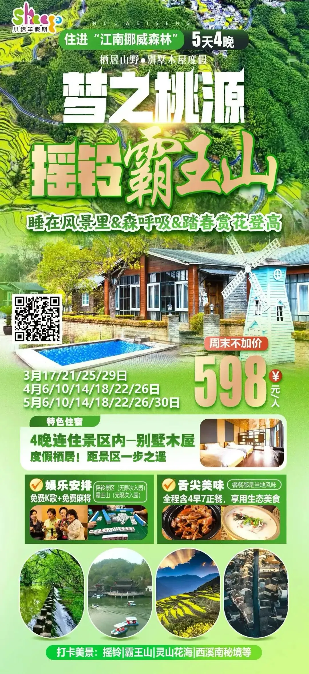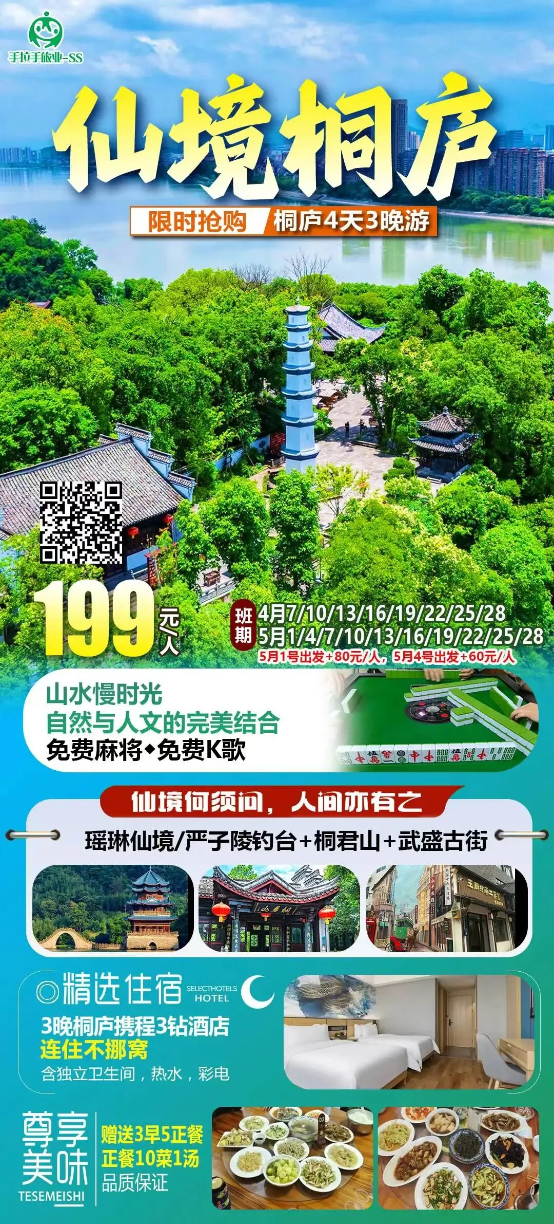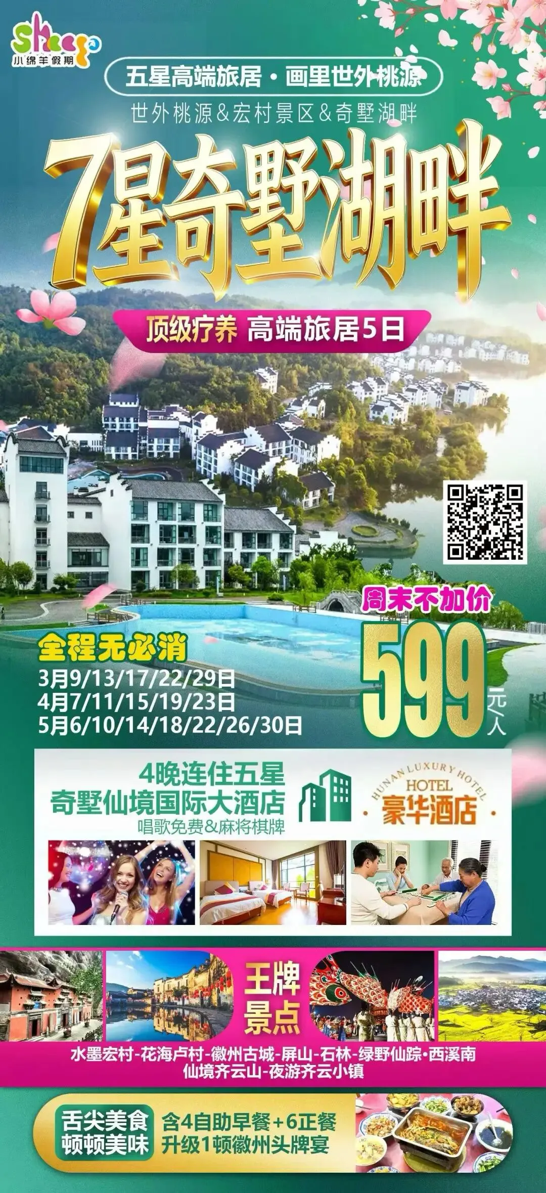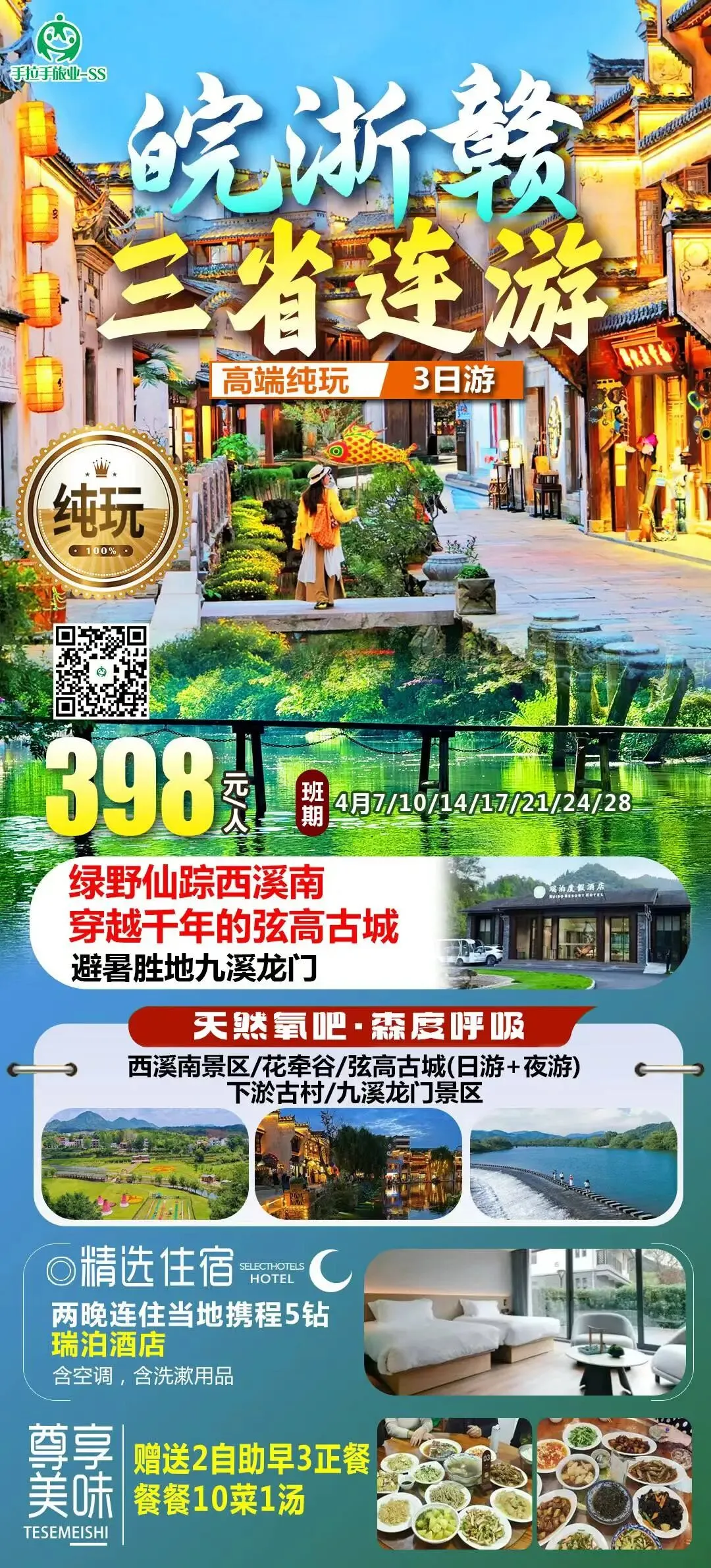 4🈷️17日,铁发,余位34,余位16,单男可拼✔ 4🈷️24日,接近成团,余位22✔ 🌸山水绩溪★康养纯玩5日游 ------------------------ 💰收客价:598+60元 ❤皖浙天路-梅干岭油菜花🔸千年仁里🔸夜游良安古城🔸灵山观澜园🔸徽州古城🔸上庄棋盘村🔸夜游龙川景区🔸胡雪岩纪念馆 ❤特别赠送星空天幕烟花秀➕徽州婚俗表演 ❤独家升级每车满40人赠送一餐烤全羊 ❤免费棋牌、免费唱歌 ❤赠送4早8正餐,餐餐升级13菜1汤,晚餐啤酒畅饮 ❤2晚入住逸享品牌山景度假山庄或同级,含空调,不含洗漱用品 ❤全程车导不套班! [强]纯玩无购物,品质旅游 ------------------------- 🚗上车点:新庄国展 🚌班期:3月10/13/17/20/24/27/31 4月3/7/10/14/17/21/24 |