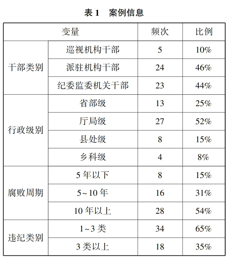 本文收集整理的52个案例均为党的十八大以来(2012一2025年)官方公开通报和披露查处的纪检监察干部腐败案例(见表1)。案例的选择主要遵循以下三个原则:一是准确性原则,所有案例均来源于中央和各地纪委监委网站和《中国纪检监察报》等权威媒体,以及中央纪委电视专题片《打铁还需自身硬》等公开报道的典型腐败案件。二是广泛性原则,案例覆盖面广,涉及多层级多领域(从中央到地方、从党政机关到国有企事业单位、从科级到省部级等),且同时涵盖了纪委监委机关干部、派驻机构干部、巡视机构干部等纪检监察系统主要类别人员。三是完整性原则,所有案例经历了“执纪审查一党纪政务处分一法院审判”的全过程。