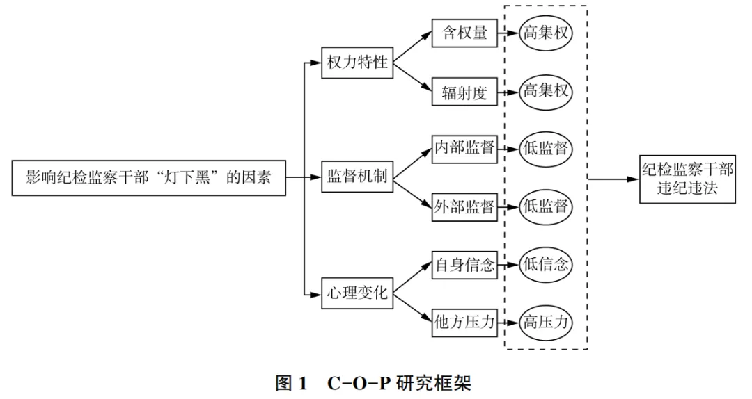 基于组态分析方法,本文从权力特性(characteristics of power)、监督机制(oversight mechanisms)、心理变化(psychological changes)3个条件变量类别出发,对纪检监察干部腐败行为展开研究。出于对纪检监察干部腐败的测量指标的量化需要,本研究将上述3个条件变量进一步拓展为权力含金量(简称含权量)、权力辐射度(简称辐射度)、内部监督、外部监督、自身信念、外在压力等6类条件变量,就这6类变量进行论证,从而形成C-O-P研究框架(见图1)。
