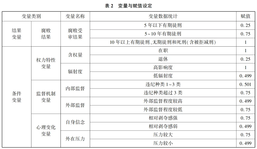 纪检监察机关“灯下黑”是一种行为,兼具过程因素和结果因素。因此,纪检监察机关“灯下黑”可以作为一种结果变量。而且,纪检监察机关“灯下黑”作为一种行为,对其进行隶属程度的赋值,应有客观的评定依据。因此,基于结果因素的认定,可以采取官方通报的“违纪违法”为判定依据,以纪检监察干部被检察机关依法立案、起诉,最终由人民法院判决生效为事实依据。从隶属程度上,选取纪检监察干部违纪违法的典型案例建立案例库,被选取的案例涉及的违纪违法事实清楚、犯罪危害明显。因此根据案例中个体受审结果作为区分结果变量的隶属关系,分别以“5年以下有期徒刑”“5~10年有期徒刑”“10年以上有期徒刑无期徒刑和死刑(含被拒减刑)”这3个维度作为隶属关系的判定标准,对其分别赋值0.5,0.75和1。