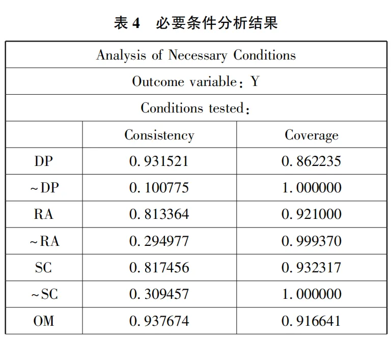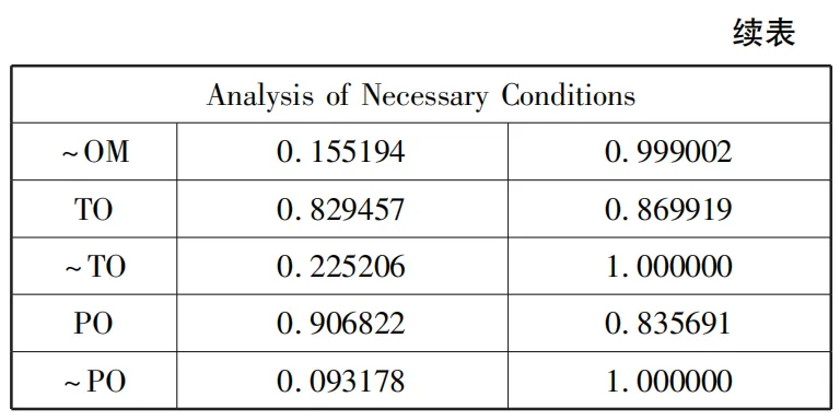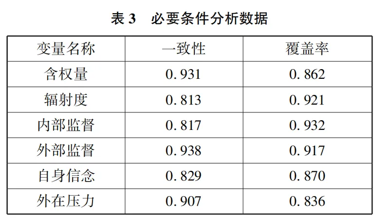 在单变量的必要性分析中,一般以变量的一致性(variables consistency)作为主要参考指标。学术界一般认为,变量的一致性数值在0.9及以上,视该变量为必要条件。在纪检监察机关腐败结果阐述的必要条件研究中,导致其腐败行为发生的6个条件变量中是否会存在必要结果,可以通过QCA的必要条件性检验(necessary condition)进行分析。在利用软件进行数据分析后,必要条件分析数据如表3所示,表4为必要条件分析结果。基于必要条件的分析结果,本研究所选用单变量的一致性最低为0.813,最高为0.938,其中含权量、外部监督、外在压力变量一致性高于0.9,表明这3个变量是发生腐败结果的必要条件。同时,选用单变量的覆率度均超过0.8,说明本研究的变量在案例中具有较高的覆盖程度。