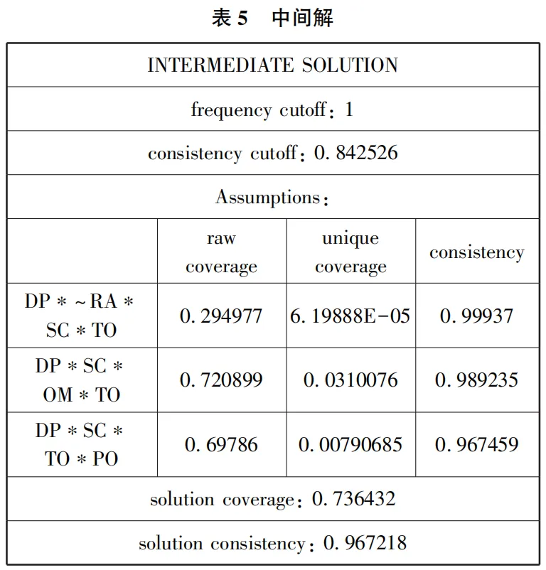 基于fsQCA的分析步骤,将本研究所选用的案例的6个条件变量和结果变量进行真值表算法(truthtable algorithm)分析,分别得出复杂解、中间解(见表5)、简单解3种,其中简单解未有相应组态,说明本研究的样本案例中不存在理论上的逻辑余项。需要说明的是,本文为了实现案例覆盖更广的目标,并未采用RPI和一致性自然间断的方法得出简单解。因此本研究的研究结果将中间解的组态作为结果组态模式的主要解释依据。从中间解的数据结果来看,本研究选用的6个条件变量共得出两组组态,覆盖率(solution coverage)为0.7364,即三组条件组态能够解释 73.64%的案例;一致性(solution consistency)为0.9672,说明6个条件变量能够充分地解释产生腐败结果的关键因素,即两组条件组态的一致性为96.72%。通常来说,研究的一致性在0.8以上即视为较为可信的研究。因此,从数据的分析结果来看,验证了本研究根据目前学术界和实务界经验所提出的含权量、辐射度、内部监督、外部监督、自身信念、外在压力6个变量,能够较好地解释纪检监察机关“灯下黑”的发生结果。
