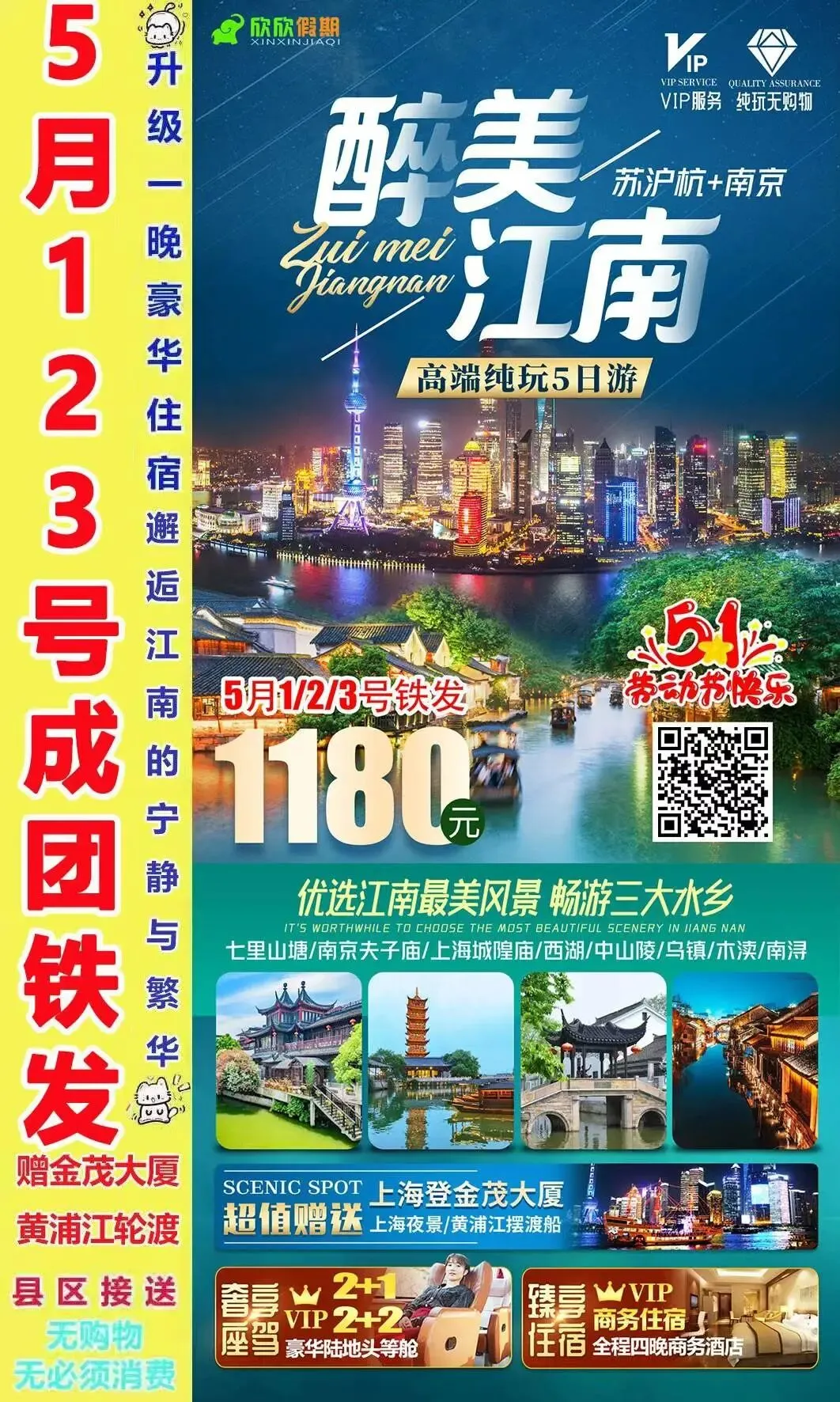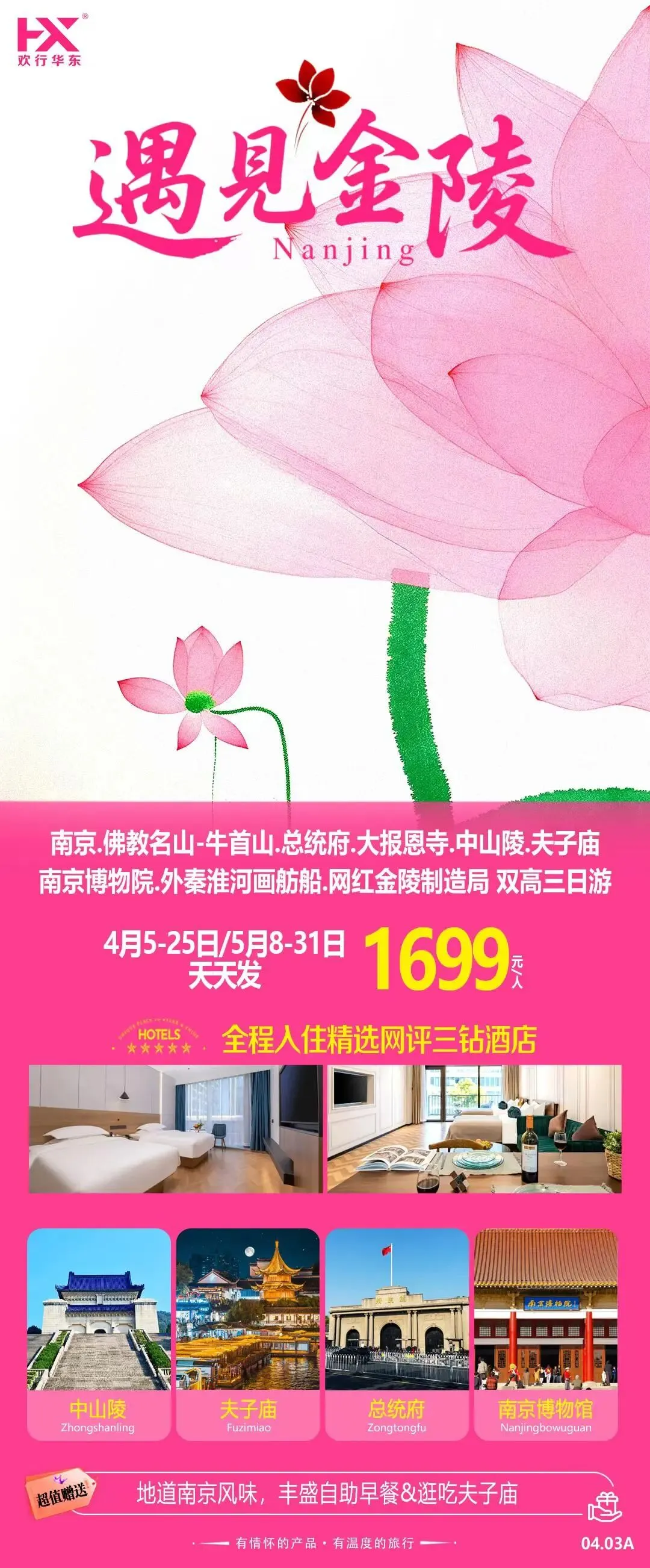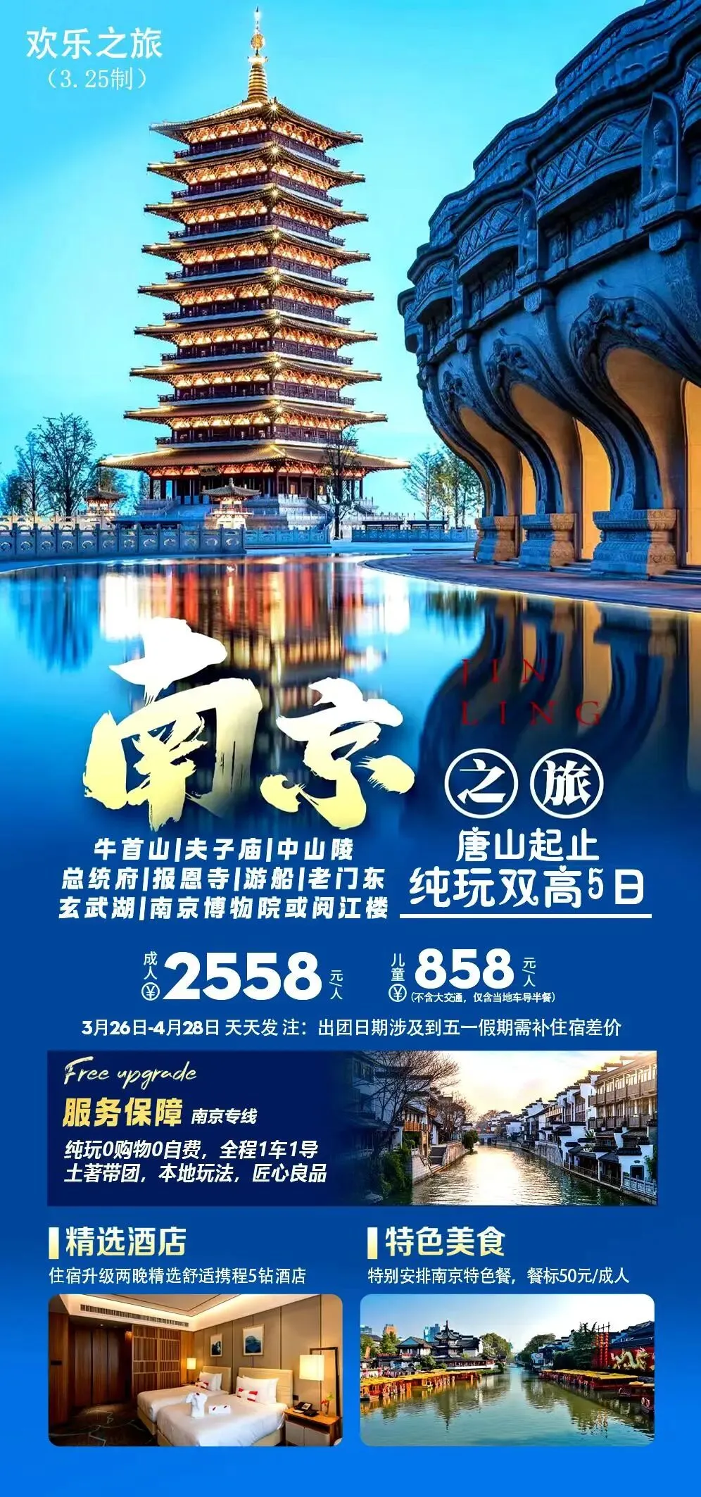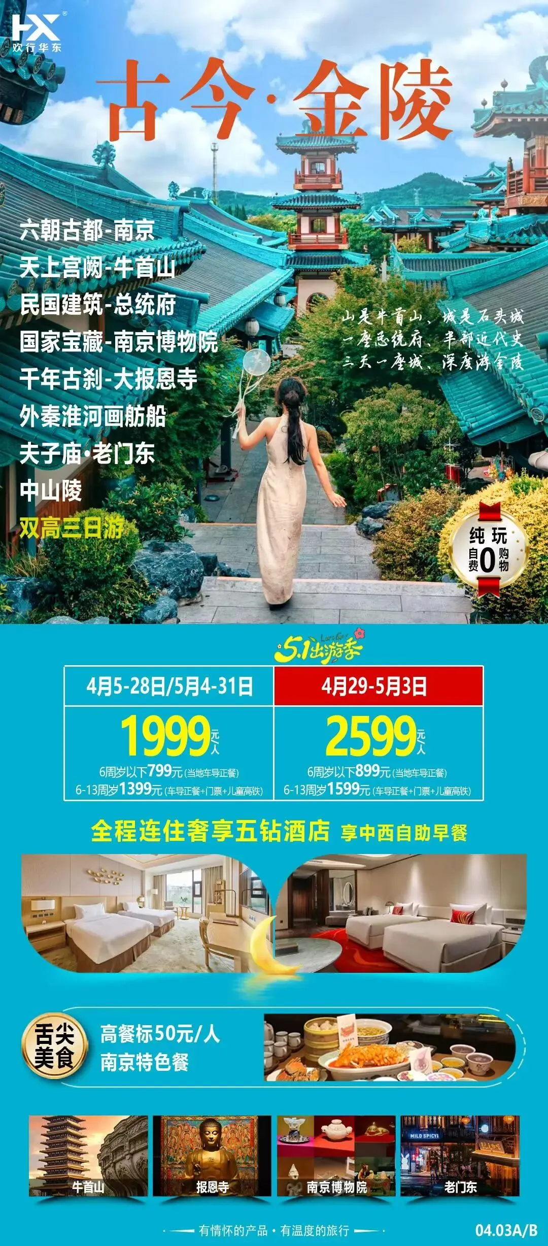 【5月1日发团】南京总统府、中山陵、雨花台、牛首山、玄武湖、阅江楼、夫子庙、老门东纯玩2+1大巴三日游