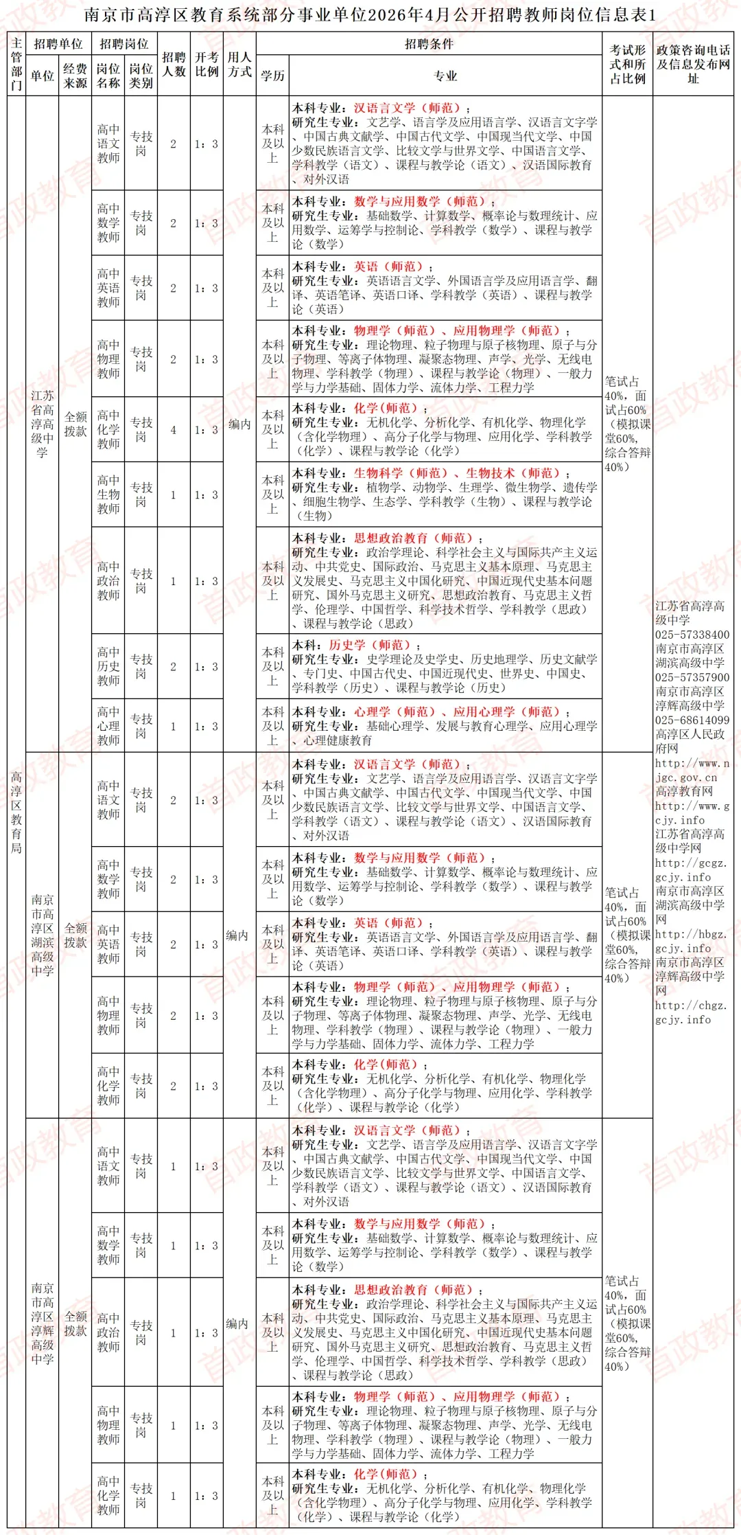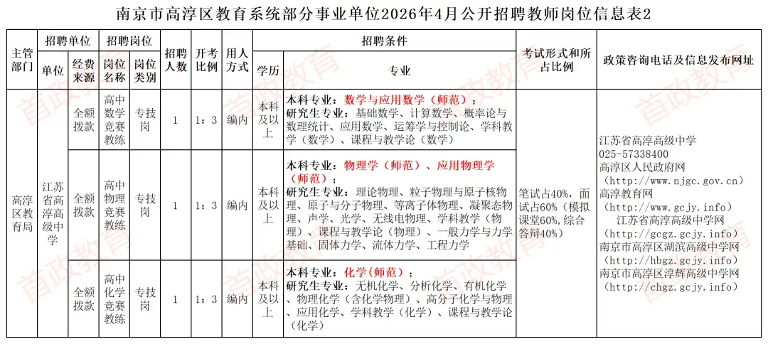 本次招聘相关信息在高淳区人民政府网(http://www.njgc.gov.cn)、高淳教育网(http://www.gcjy.info)、江苏省高淳高级中学网(http://gcgz.gcjy.info)、南京市高淳区湖滨高级中学网(http://hbgz.gcjy.info)、南京市高淳区淳辉高级中学网(http://chgz.gcjy.info)等网站发布。具体的招聘岗位、数量、资格条件等详见附件:《南京市高淳区教育系统部分事业单位2026年4月公开招聘教师岗位信息表1》及《南京市高淳区教育系统部分事业单位2026年4月公开招聘教师岗位信息表2》,以下简称《岗位信息表1》及《岗位信息表2》。