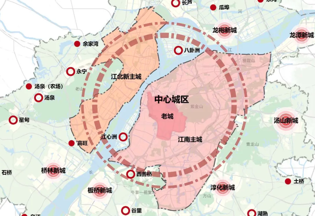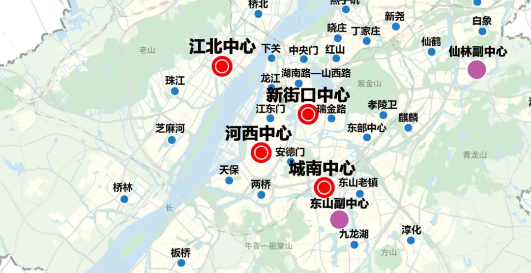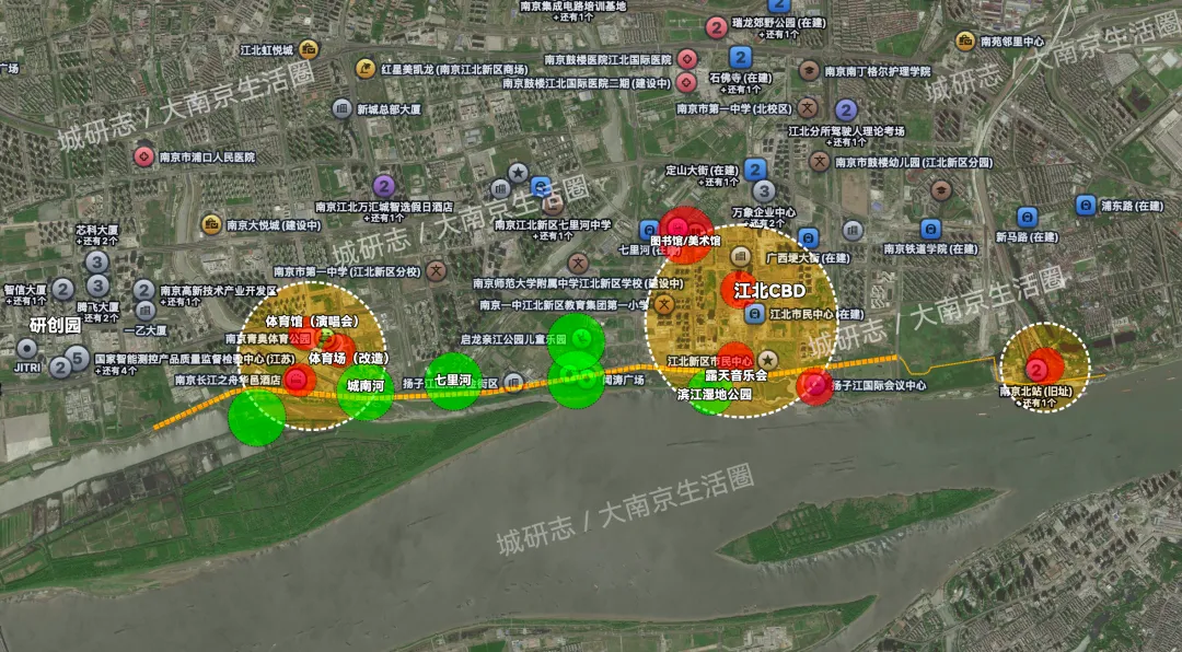 怎么解决?南京的做法很直接。本地文化土壤不够肥沃、积累不足,那么就直接通过江南市级功能的下方、导入,在江北开拓一个全新的市级中心,集文化、教育、医疗、金融、科创等核心要素为一体。