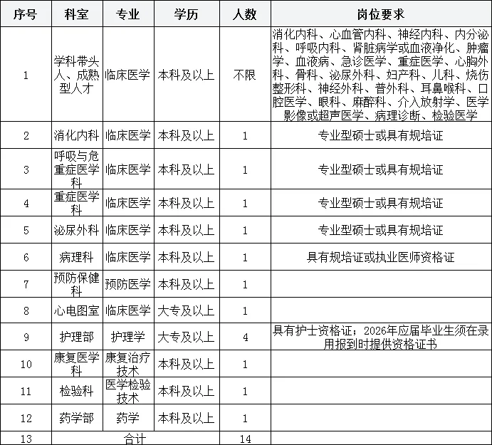 2.护理岗位要求:年龄不超过28周岁(1998年1月1日后出生);护理专业全日制大专及以上学历(不含“3+2”“3+3”高职毕业生);具有护士资格,2026年应届毕业生须在录用报到时提供资格证书。