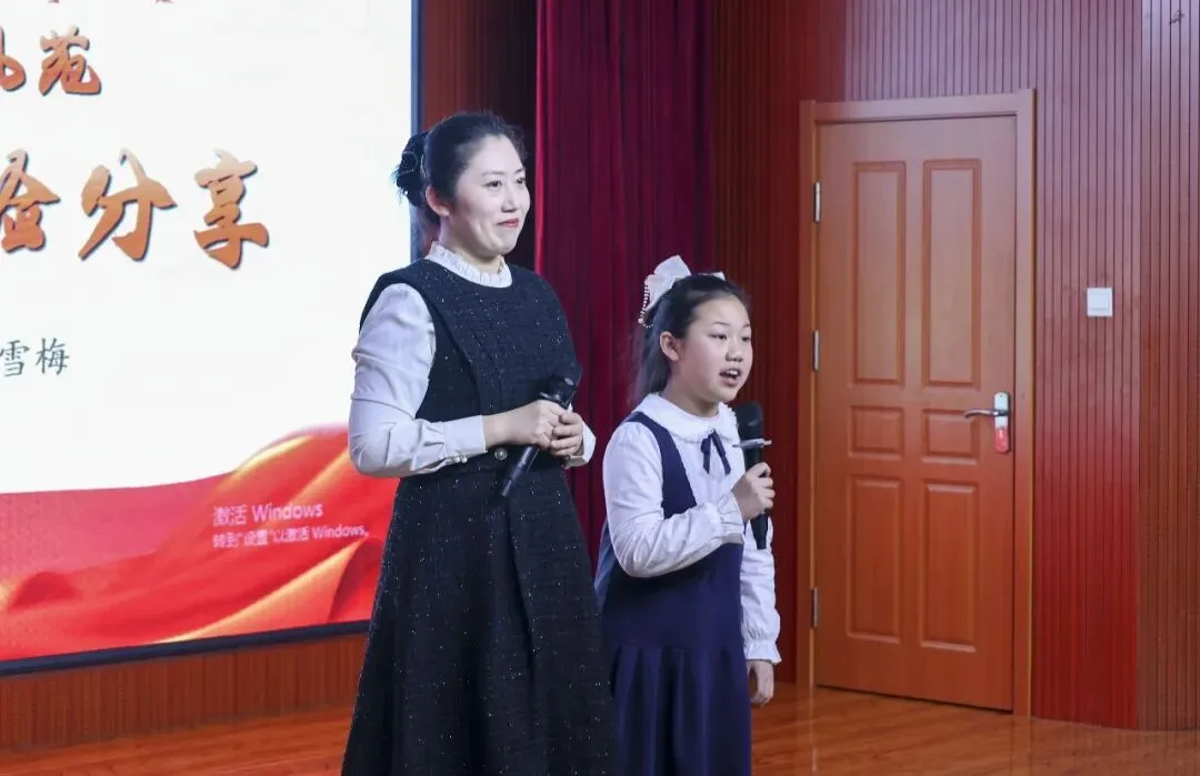 活动每一个环节都传递着书香力量与红色温度。学校正式组建“玖阅领航”导师团,并为成员颁发聘书,为学生的阅读之路保驾护航;导师团代表郭霁虹老师现场分享实用高效的亲子阅读方法,用专业的指导为家长和学生搭建起亲子共读的桥梁;五年四班闵芮同学与家长携手登台,温情分享亲子共读过程中的成长与感悟,字字真挚、句句暖心,传递出家校共育的温暖力量与育人共识。随后,三年二班学生演绎的红色情景剧《八女投江》精彩上演,孩子们以真挚的情感、生动的演绎,再现了革命先烈挺身而出、奋勇抗争的英勇壮举,深深感染了在场每一位观众,让红色精神在潜移默化中浸润人心。