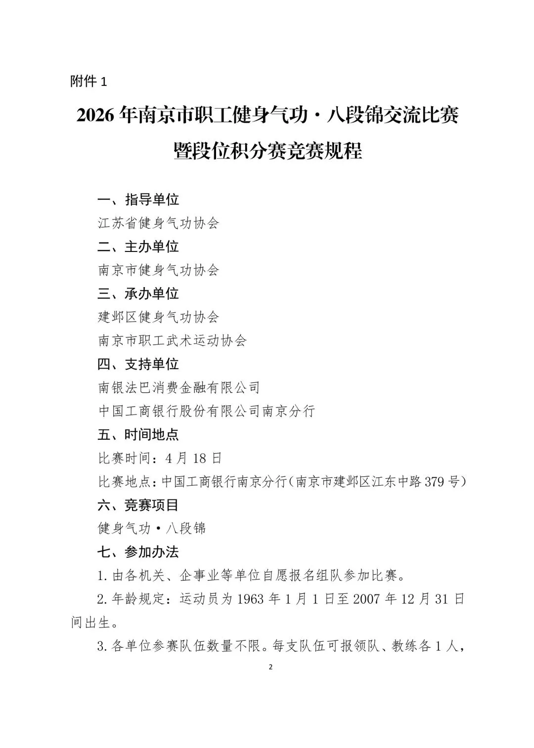 >竞赛规程||2026年南京市职工健身气功·八段锦交流比赛暨段位积分赛竞赛规程