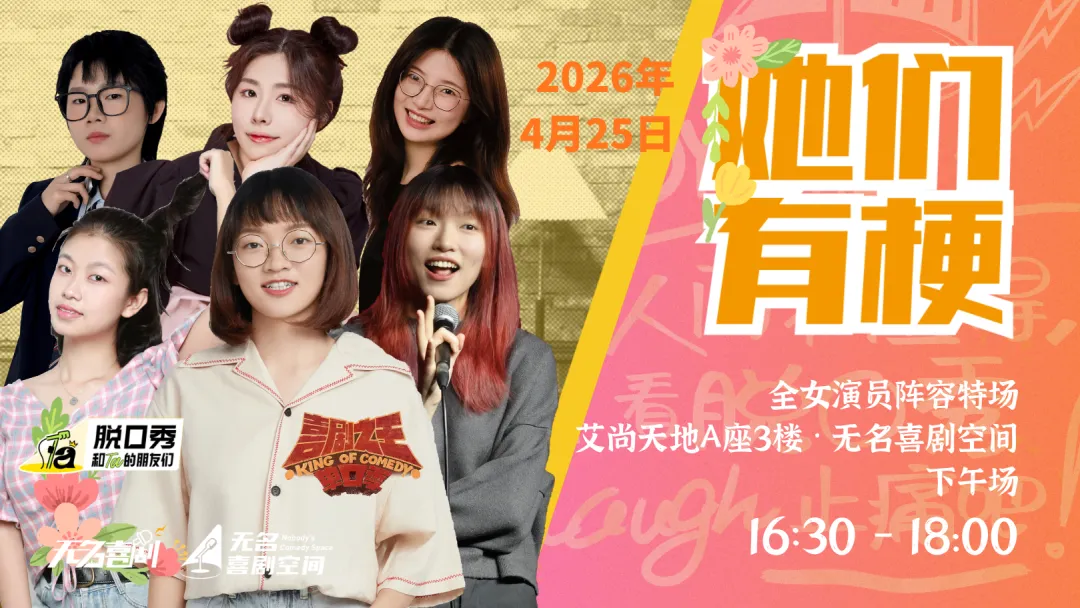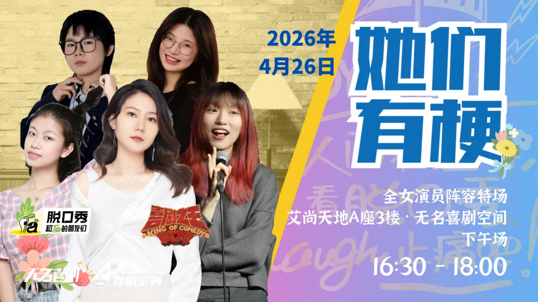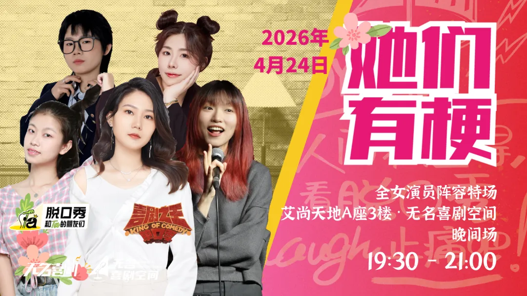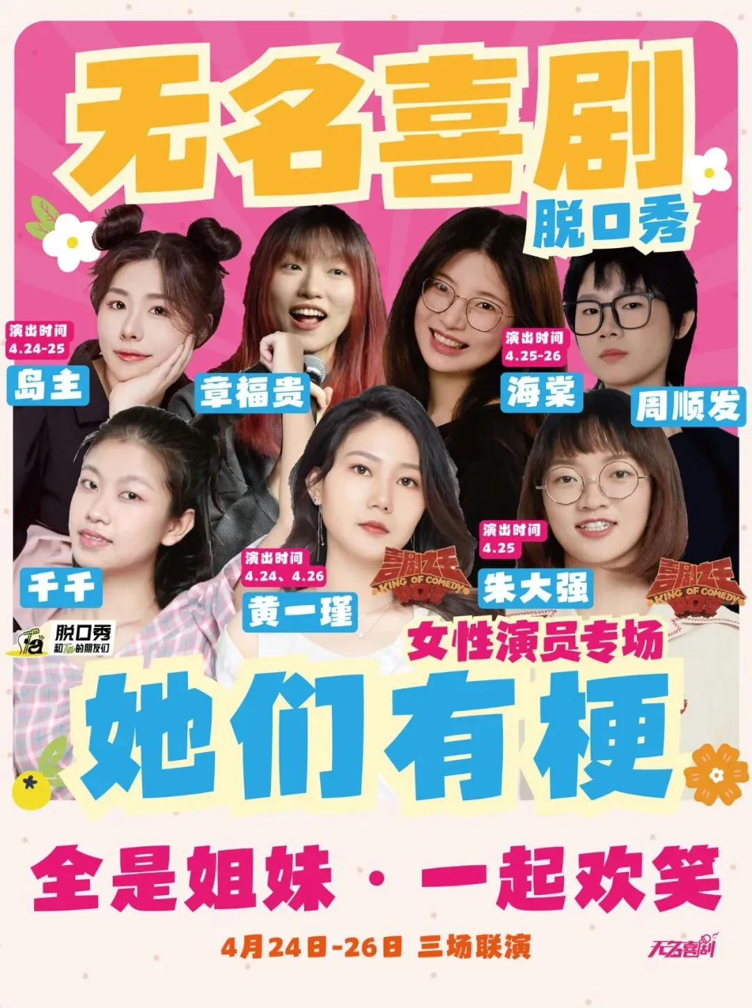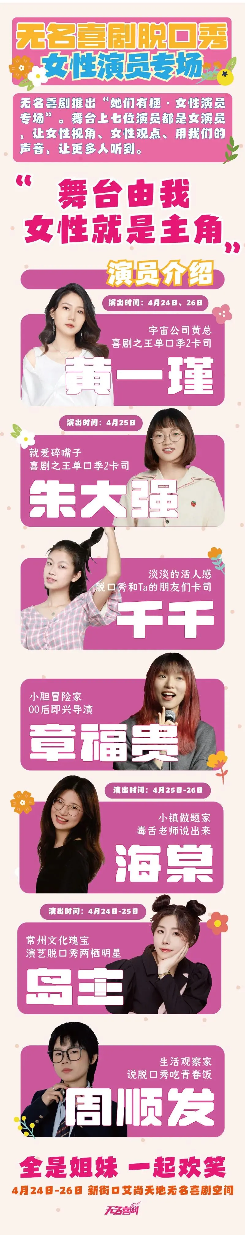 4月24日-26日,她们最有梗!无名喜剧推出“女性演员专场”,舞台上七位演员都是女演员,让我们的声音,被更多人听到!