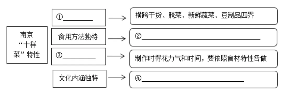 ①文中第④段提到“堪称大规模的跨界,横跨了干货、腌菜、新鲜蔬菜、豆制品四界”,表明南京“十样菜”在食材选取上种类丰富,涵盖多个品类,体现出其在食材方面的独特性。