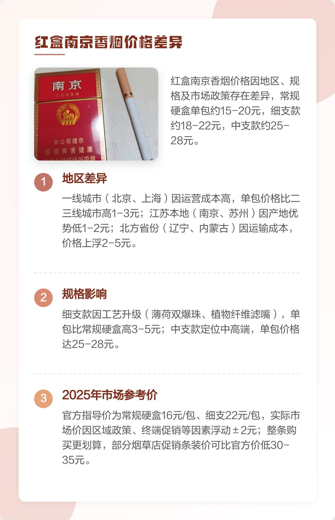 南京(红)香烟目前主打单一款式,市场定价稳定,具体价格如下: