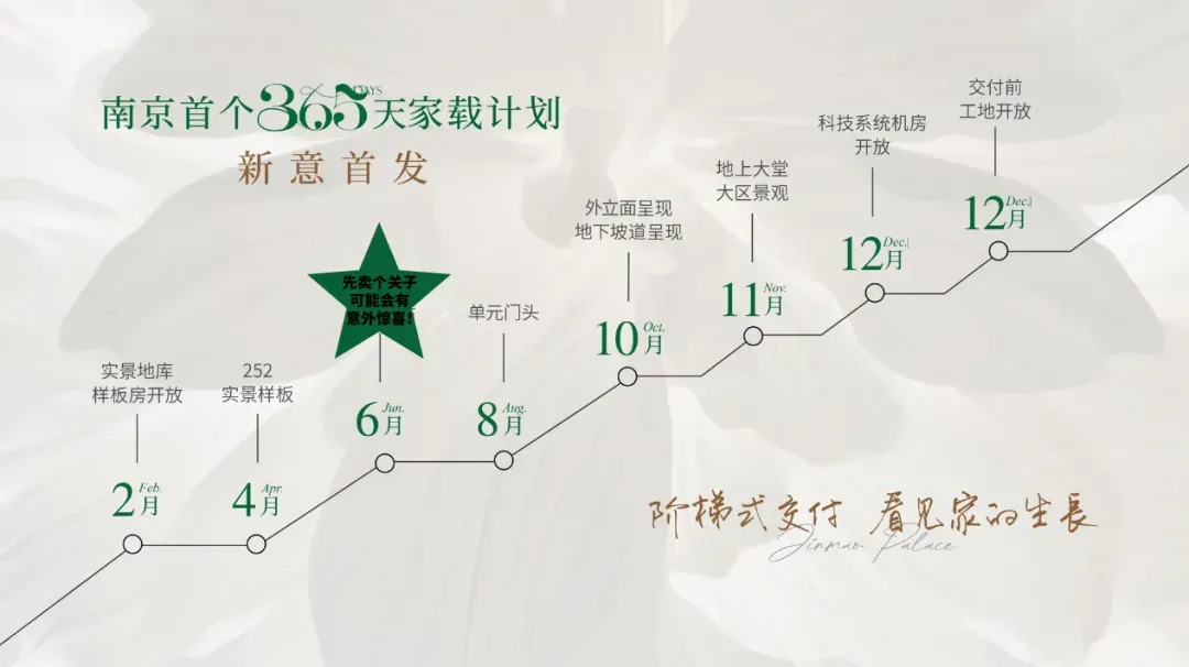 秦淮金茂府直接把这块石头搬走了。2025年,它推出“365天家载计划”,作为南京首个阶梯式交付项目,它把一整年的节点全部公开:
