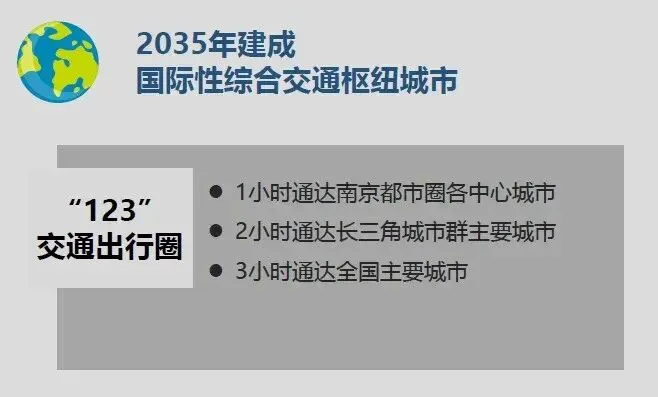 “123”交通出行圈,即1小时通达南京都市圈各中心城市,2小时通达长三角城市群主要城市,3小时通达全国主要城市。是《南京市国土空间综合交通规划(2021—2035年)》中极具分量的承诺之一。