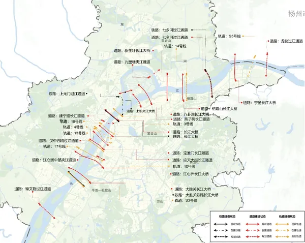 截至目前,南京已建成通车12处14条过江通道,包括9条道路过江通道、2条铁路过江通道和3条城市轨道过江通道。规划新建的通道中,轨道方面包括17号线、13号线、18号线和14号线4条跨江线路,道路方面包括锦文路过江通道、汉中西路过江通道和七乡河过江通道3条。