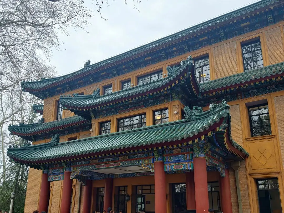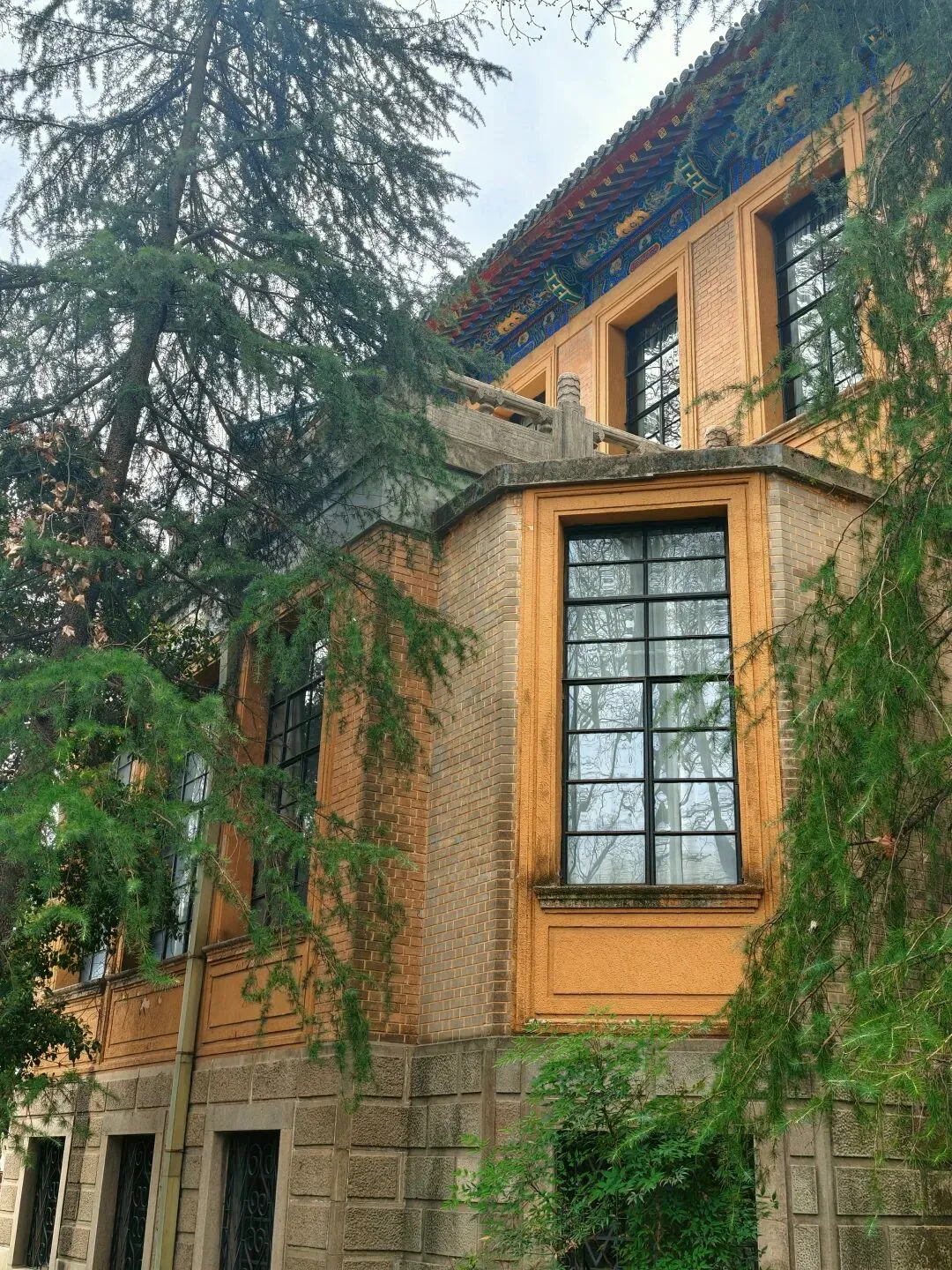 是宋美龄亲自参与设计的公寓楼,被誉为“远东第一别墅”。别墅的两边是延生开来的环山道路,种满法国梧桐,美龄宫就像一颗宝石坠子镶嵌其中。从外面看整体非常中式,黄墙红柱青瓦。国风的飞檐,檐下的琉璃瓦上雕刻着凤凰。