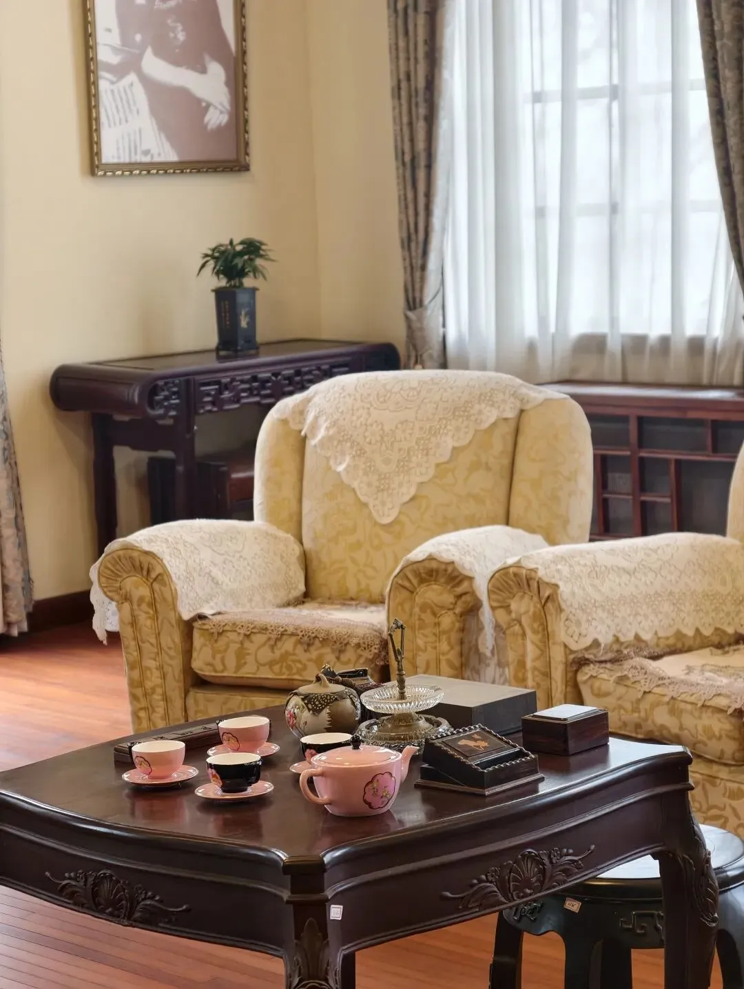 开始参观。一楼客厅。欧式真皮沙发搭配红木家具,宋美龄是懂混搭的。