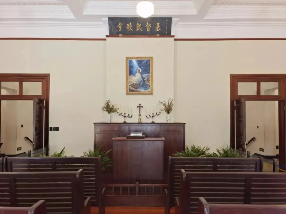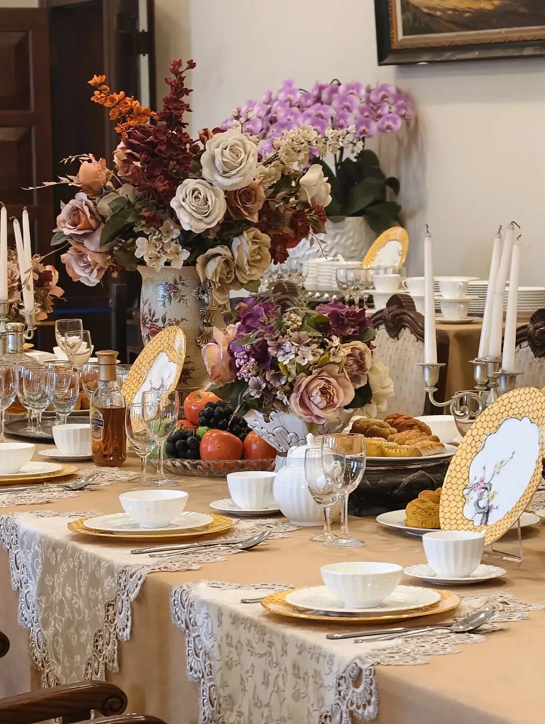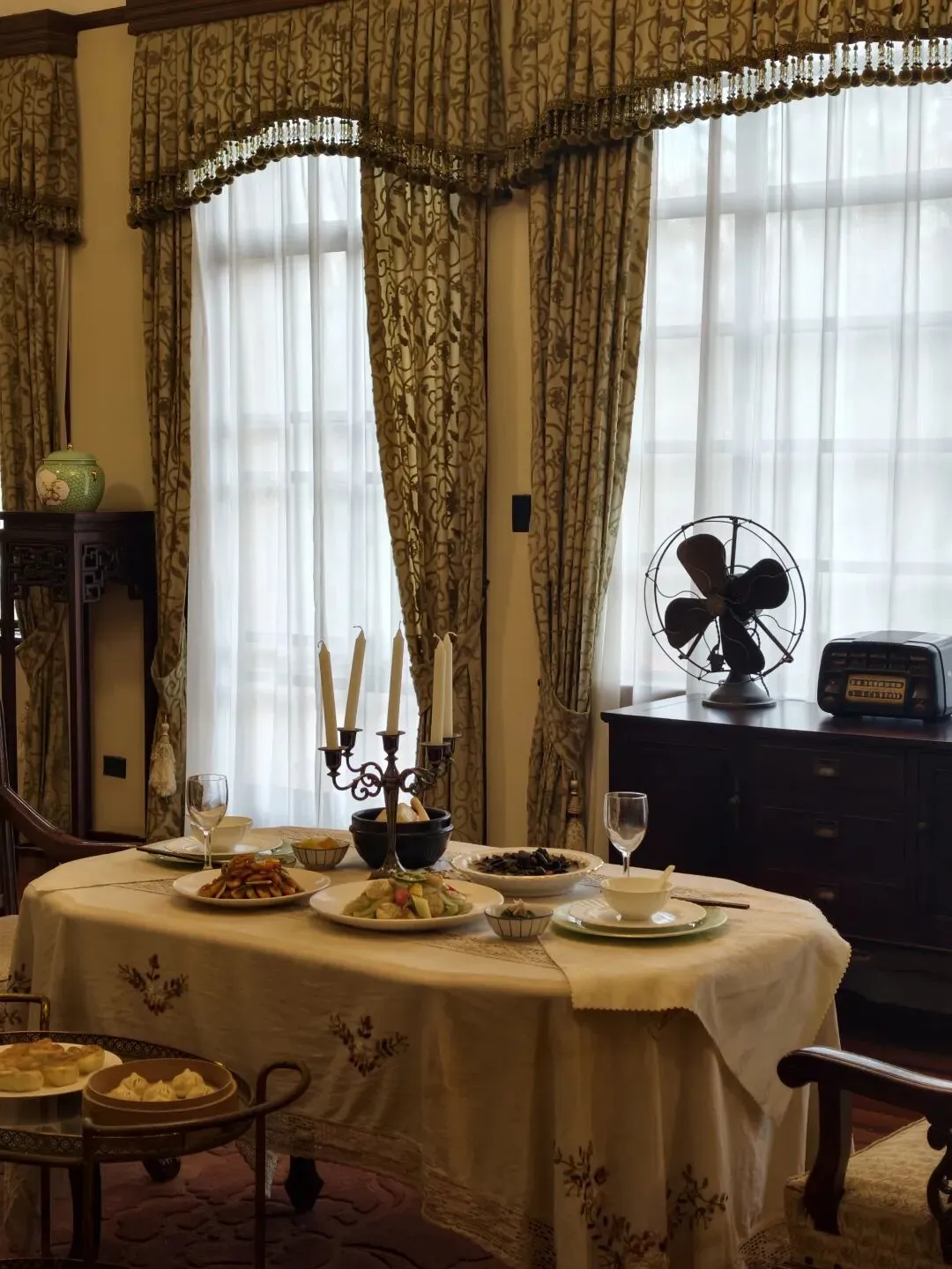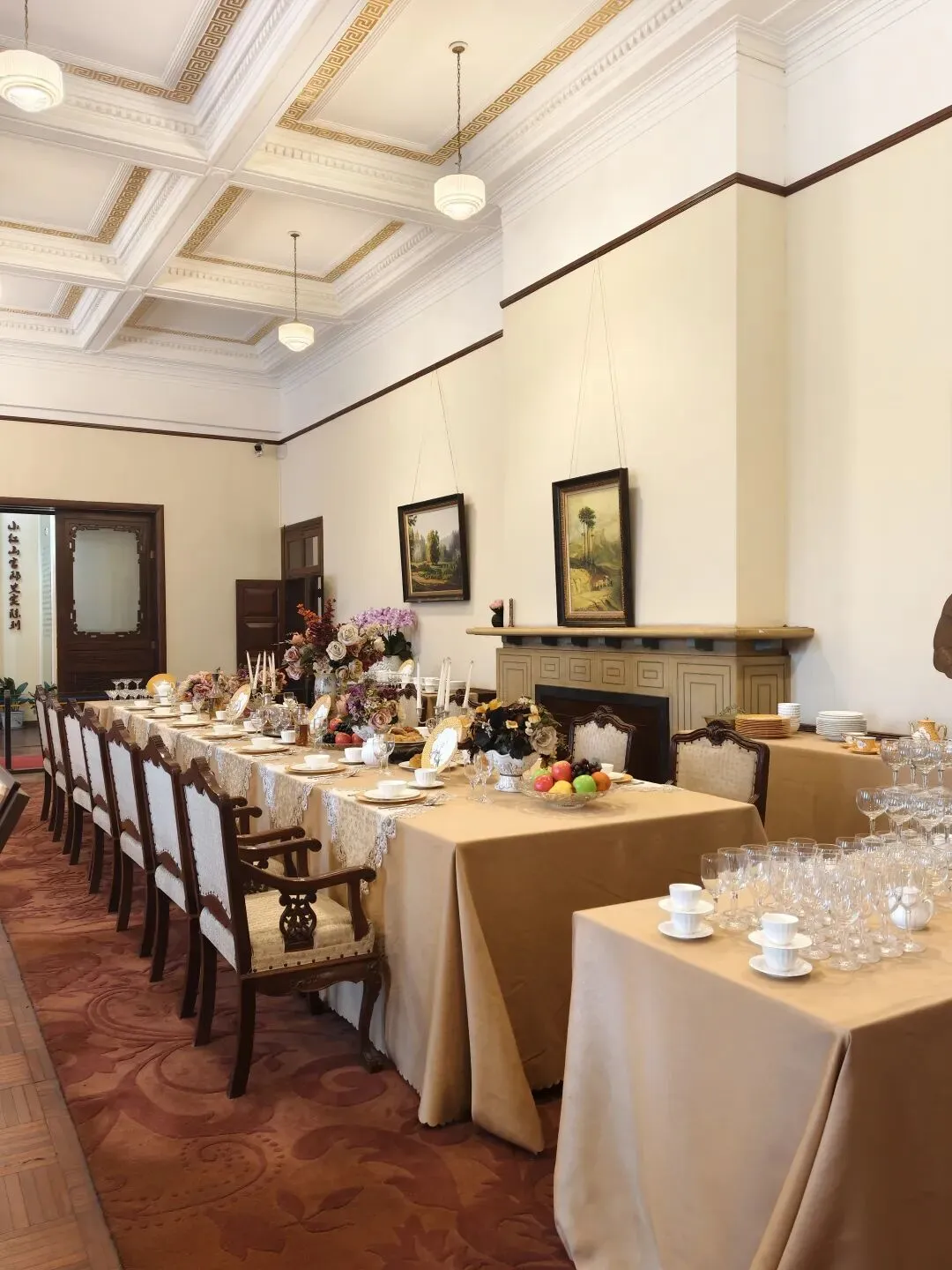 二楼宴会厅。西式宴会长桌,桌上还原着银质餐具。