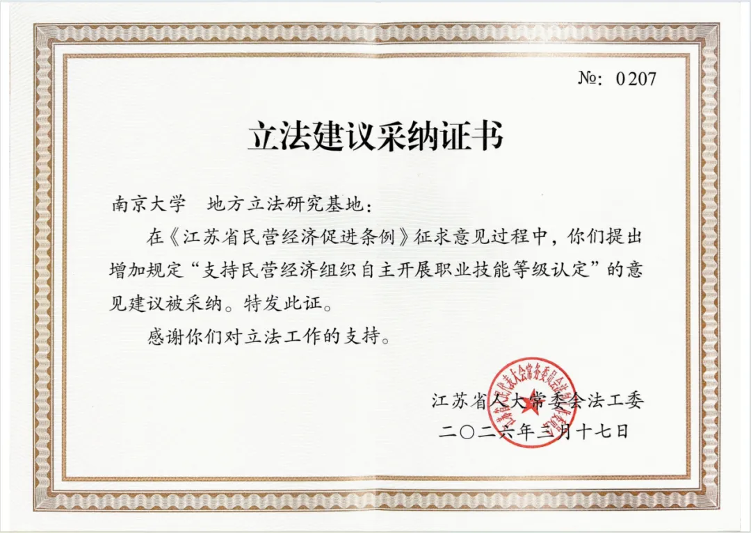 2025年,为了优化民营经济发展环境,保证各类经济组织公平参与市场竞争,促进民营经济健康发展和民营经济人士健康成长,江苏省人大常委会决定制定《条例》。在制定过程中,南京大学江苏省地方立法研究基地研究人员梁金钢博士所提出的立法建议获得采纳。