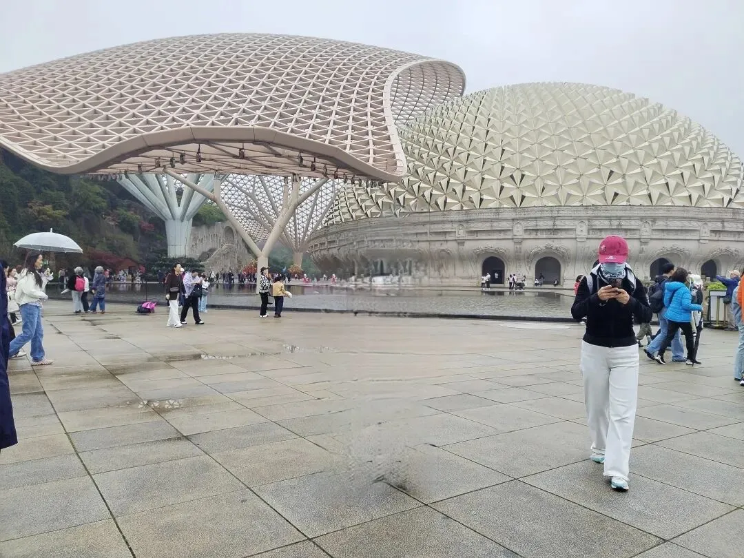 我们主要游览的核心区域是斥巨资打造的佛顶宫与佛顶塔。 在雨雾缭绕中,远远便望见那座造型奇特的佛顶宫。因其半圆状外形酷似“大榴莲”,同行的人纷纷打趣这个亲切的昵称。这座建筑实际上是建筑史上的奇迹,它是建在当年废弃矿坑之上的深坑建筑,施工周期历时3年,听说高峰时每天有四五千名工人同时作业, 曾获詹天佑奖与鲁班奖两项最高荣誉。佛顶塔高88米,四面九层,第一层是中国美院集体创作的佛教典籍壁画,第八层安放万斤大钟,据说一公里之外都能听到钟声。
