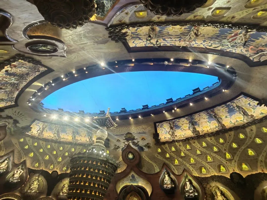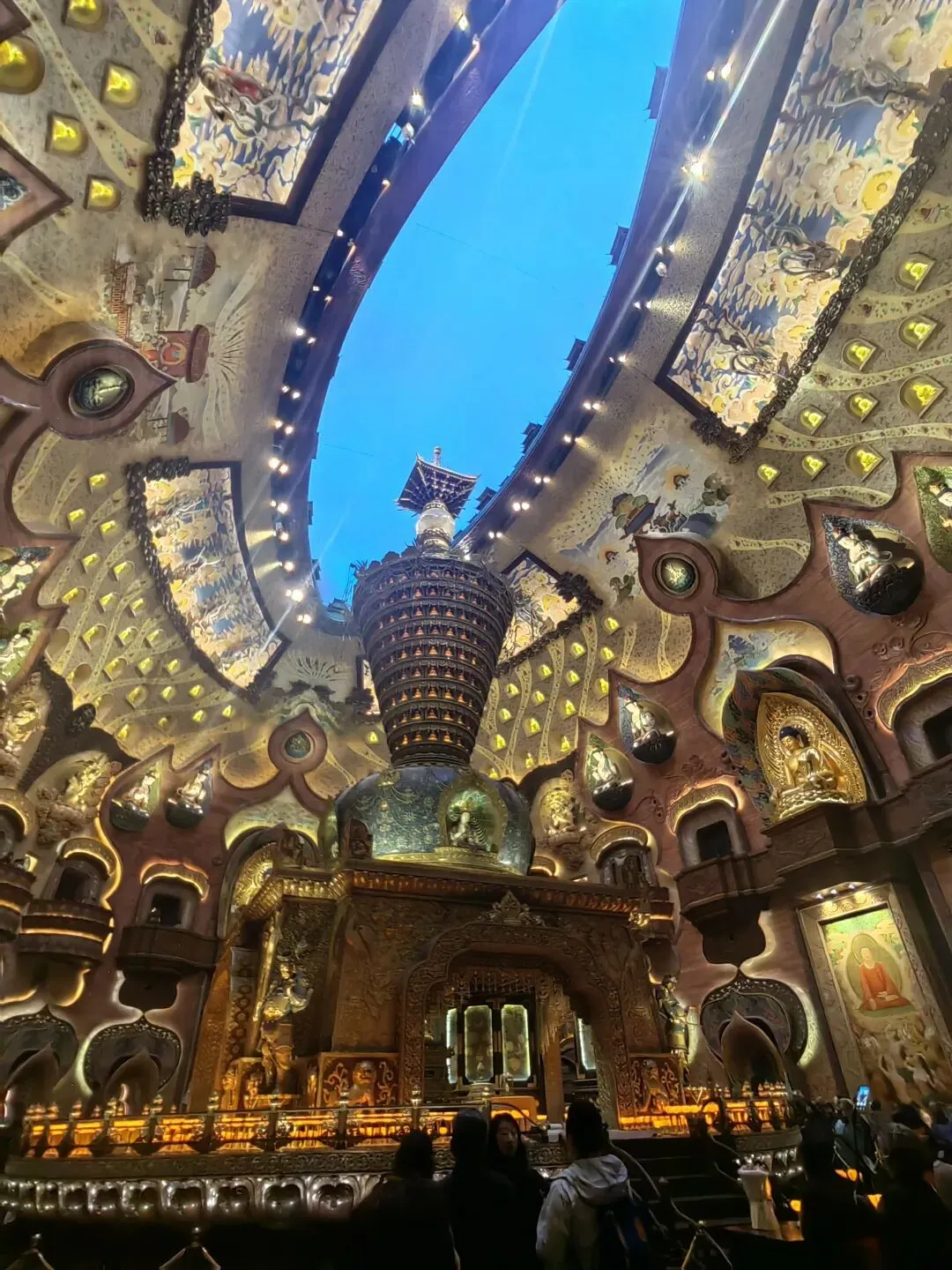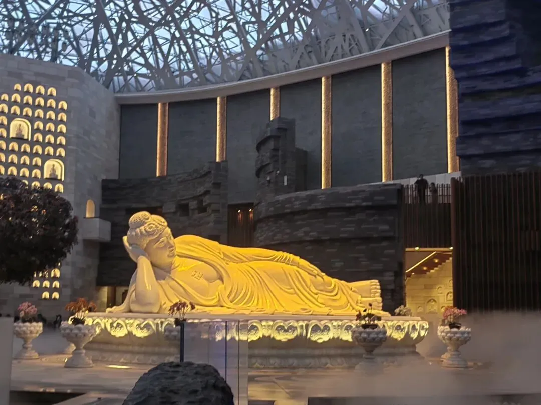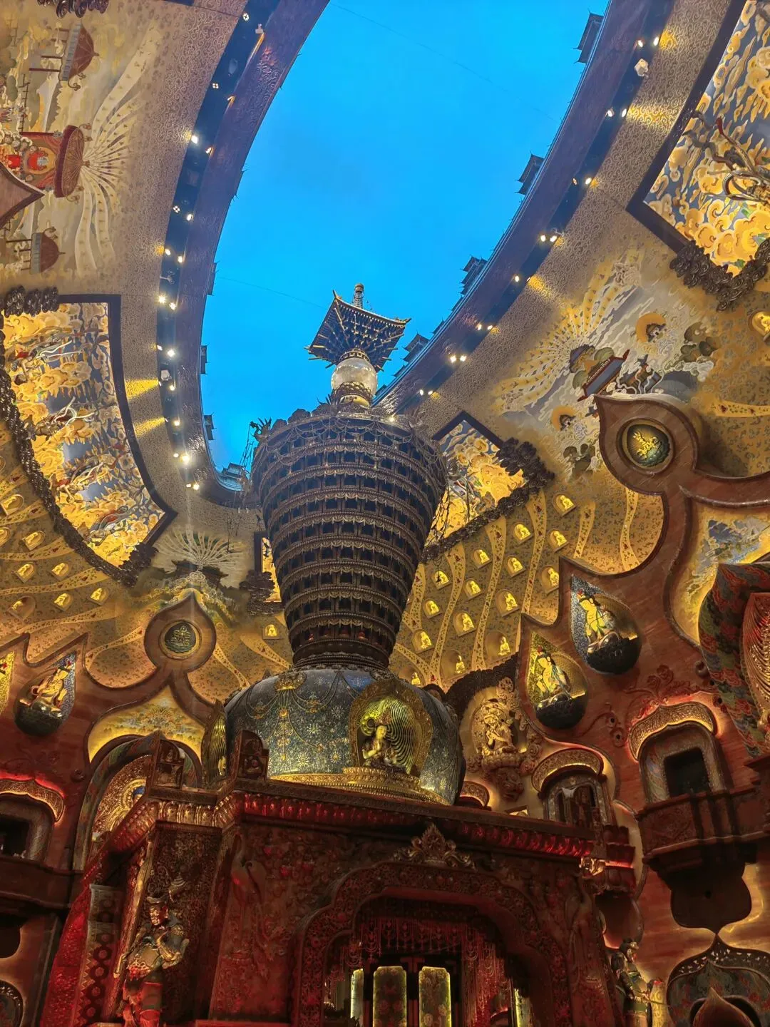 乘坐电梯深入佛顶宫,里面的景象只能用“金碧辉煌”来形容。佛顶宫内部分为禅境大观、千佛殿和万佛廊等空间。走入地宫,灯光营造出的光影效果美轮美奂,庄重之感油然而生。千佛殿内有一座21.8米高的舍利圣塔,塔身表面鎏金,富丽堂皇地呈现着佛教的神圣场景。最令人感到震撼与殊胜的,是这里供奉着当世仅存、世间唯一的佛教界至高圣物,释迦牟尼佛顶骨舍利。这枚佛顶真骨出土于南京大报恩寺地宫,是世界现存唯一一枚佛祖真身顶骨舍利。虽然我们此行恰逢非瞻礼开放日,但仅仅是站在那肃穆庄严的舍利藏宫外,也能感受到那份超越时空的宁静与神圣。