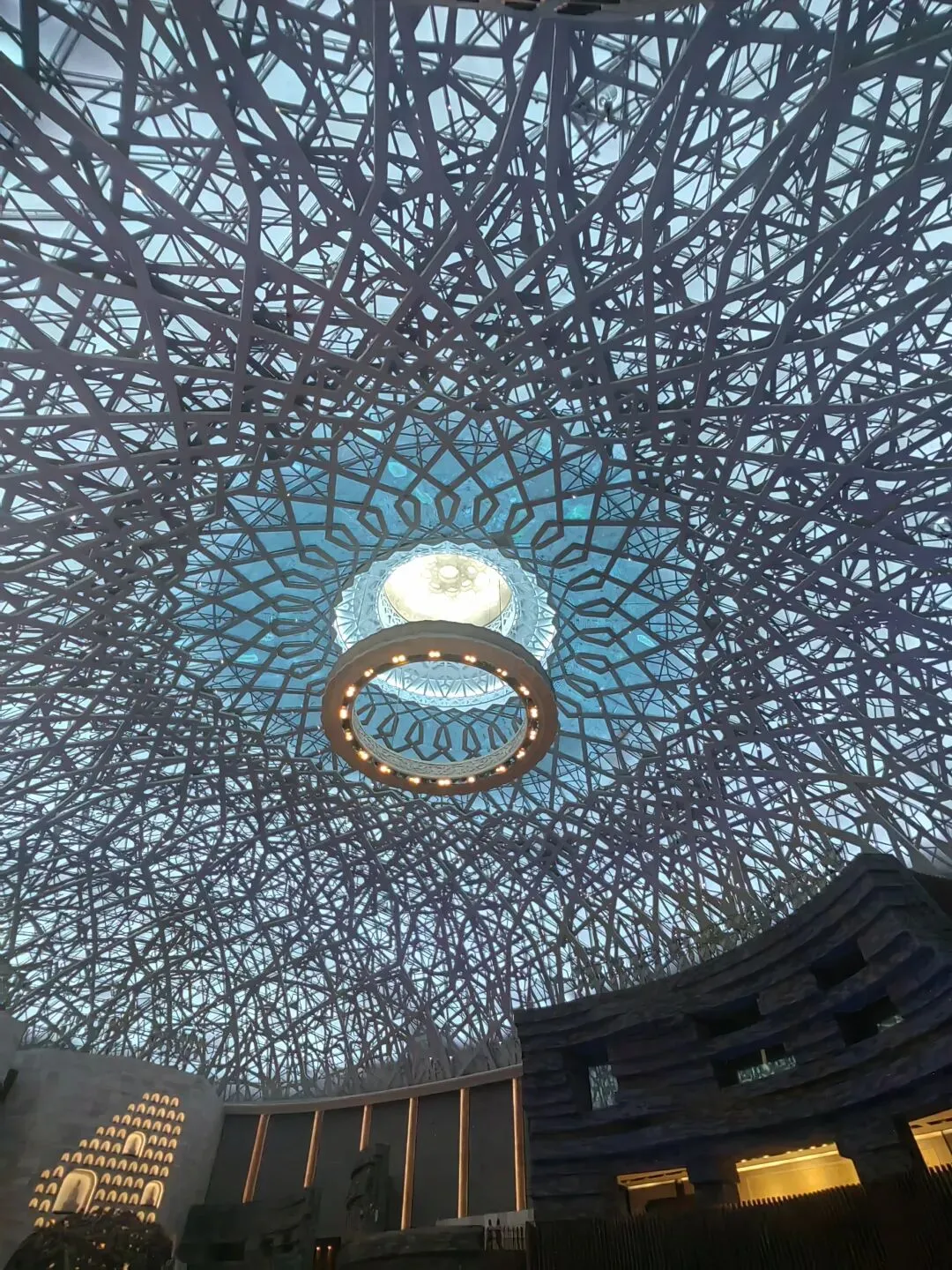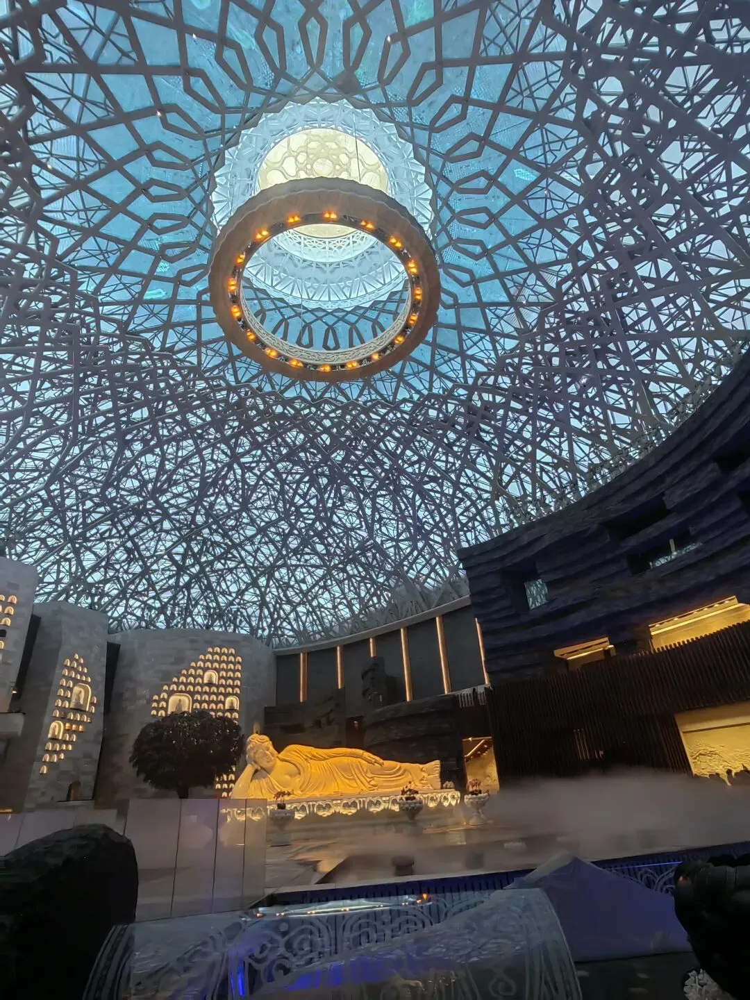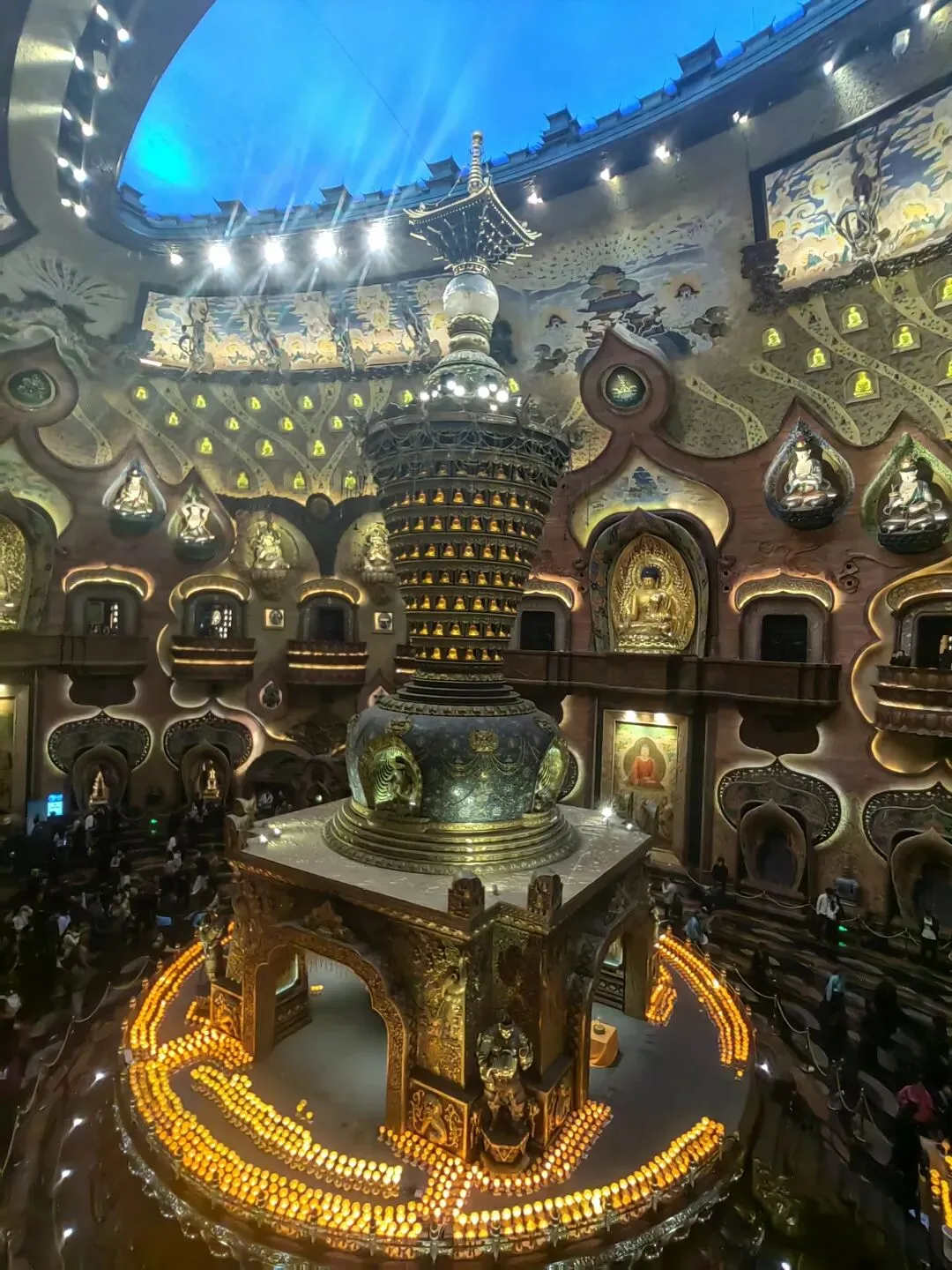 乘坐电梯深入佛顶宫,里面的景象只能用“金碧辉煌”来形容。佛顶宫内部分为禅境大观、千佛殿和万佛廊等空间。走入地宫,灯光营造出的光影效果美轮美奂,庄重之感油然而生。千佛殿内有一座21.8米高的舍利圣塔,塔身表面鎏金,富丽堂皇地呈现着佛教的神圣场景。最令人感到震撼与殊胜的,是这里供奉着当世仅存、世间唯一的佛教界至高圣物,释迦牟尼佛顶骨舍利。这枚佛顶真骨出土于南京大报恩寺地宫,是世界现存唯一一枚佛祖真身顶骨舍利。虽然我们此行恰逢非瞻礼开放日,但仅仅是站在那肃穆庄严的舍利藏宫外,也能感受到那份超越时空的宁静与神圣。