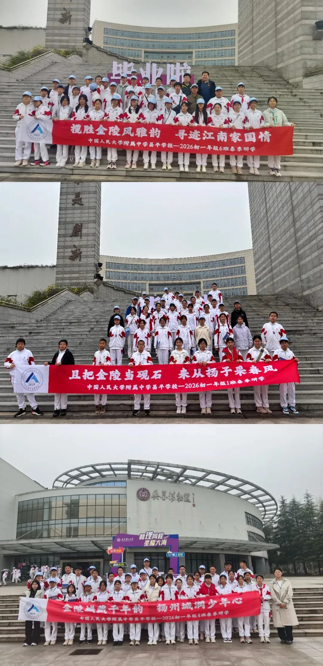 探访金陵,寻觅古韵。清明到来之际,初一年级走进六朝古都南京,感受江南厚重的历史底蕴。这里,有桃红柳绿的生机盎然,也有亭台楼阁的大气雅致;有大屠杀生灵涂炭的支离破碎,也有“人间正道是沧桑”的慷慨激昂。我们在典雅的园林里领略江南文化,在南京大屠杀遇难同胞纪念馆中学会珍爱和平。这段旅程,是一次成长的修行,指引我们不断奋进,向美好的未来出发!