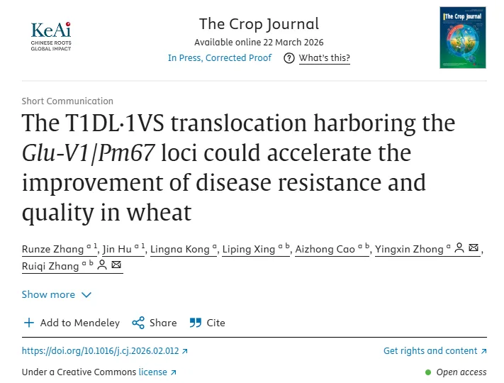 近日,南京农业大学张瑞奇教授团队在The Crop Journal在线发表了题为“The T1DL·1VS translocation harboring the Glu-V1/Pm67 loci could accelerate the improvement of disease resistance and quality in wheat”的研究论文。该研究通过遗传重组,将小麦野生近缘种簇毛麦的抗白粉病基因Pm67和优质高分子量麦谷蛋白亚基(HMW-GS)V71位点聚合到1VS染色体臂上,创制出了V71/Pm67位点共分离遗传、显著提高白粉病抗性和面筋强度且对产量相关性状无负向效应的新型小麦–簇毛麦T1DL·1VS易位系,突破了优质与抗病协同改良效率低的育种瓶颈,将推进小麦优质抗病新品种培育进程。