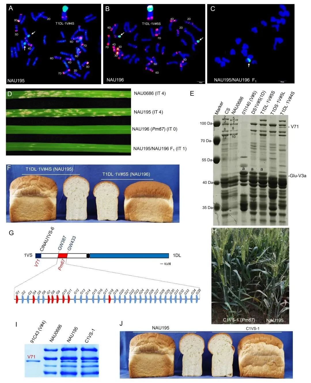 (A)T1DL·1VS易位系NAU195(2n = 42)的GISH/FISH图谱,显示一对1D染色体被一对T1DL·1V#4S易位染色体所替代。(B)纯合T1DL·1V#5S易位系NAU196(2 n = 42)的GISH/FISH图谱。(C)NAU195/NAU196 F1植株中期I分裂相,显示T1DL·1VS易位染色体配对形成一个环状二价体。(D)苗期接种白粉菌小种Bgt E09后,NAU195、NAU196及NAU195/NAU196 F1植株的反应。(E)SDS-PAGE检测小麦种子胚乳中谷蛋白亚基的组成。(F)T1DL·1VS易位系NAU195与NAU196的面包体积比较。(G)染色体臂1VS上 Glu-V1/Pm67位点的遗传作图,以及参考基因组中 Pm67区间内的注释基因;红色三角形表示NLR基因。(H)C1VS-1在成株期表现高抗白粉病,表明其携带 Pm67基因。(I)SDS-PAGE鉴定表明,C1VS-1含有额外的V71高分子量谷蛋白亚基。(J)C1VS-1的面包体积与NAU195相近。