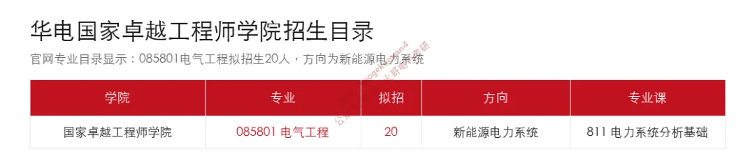 根据华电国家卓越工程师学院官网发布的《国家卓越工程师学院2026年全日制专业学位和学术学位硕士研究生招生专业目录》,085801电气工程拟招生20人,研究方向为新能源电力系统,专业课为811电力系统分析基础。