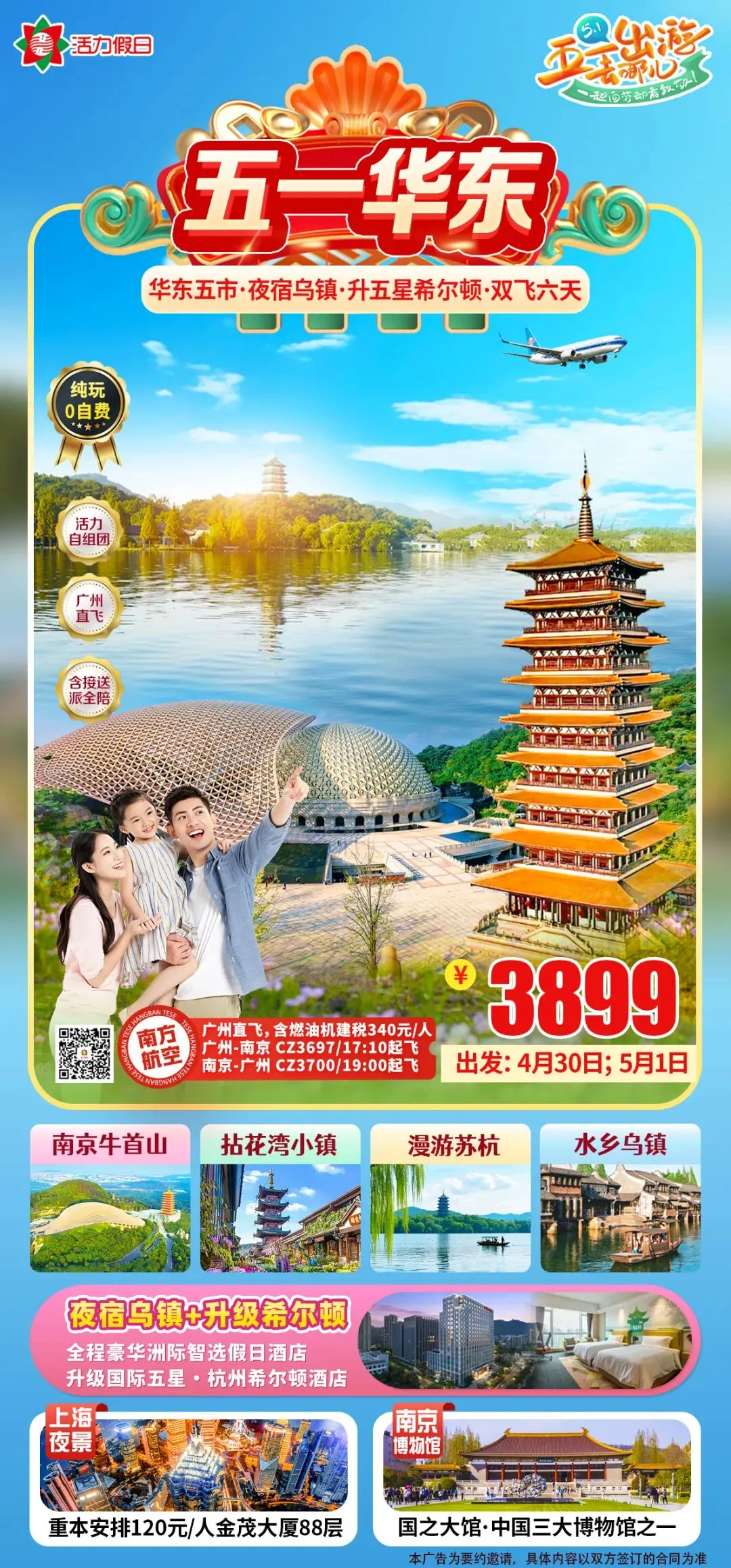五一出发!够晒“平”!全景江南、金陵南京、漫游苏杭!夜宿乌镇+升级希尔顿!登上海金茂大厦!纯玩0自费双飞六天!爽玩整个假期!