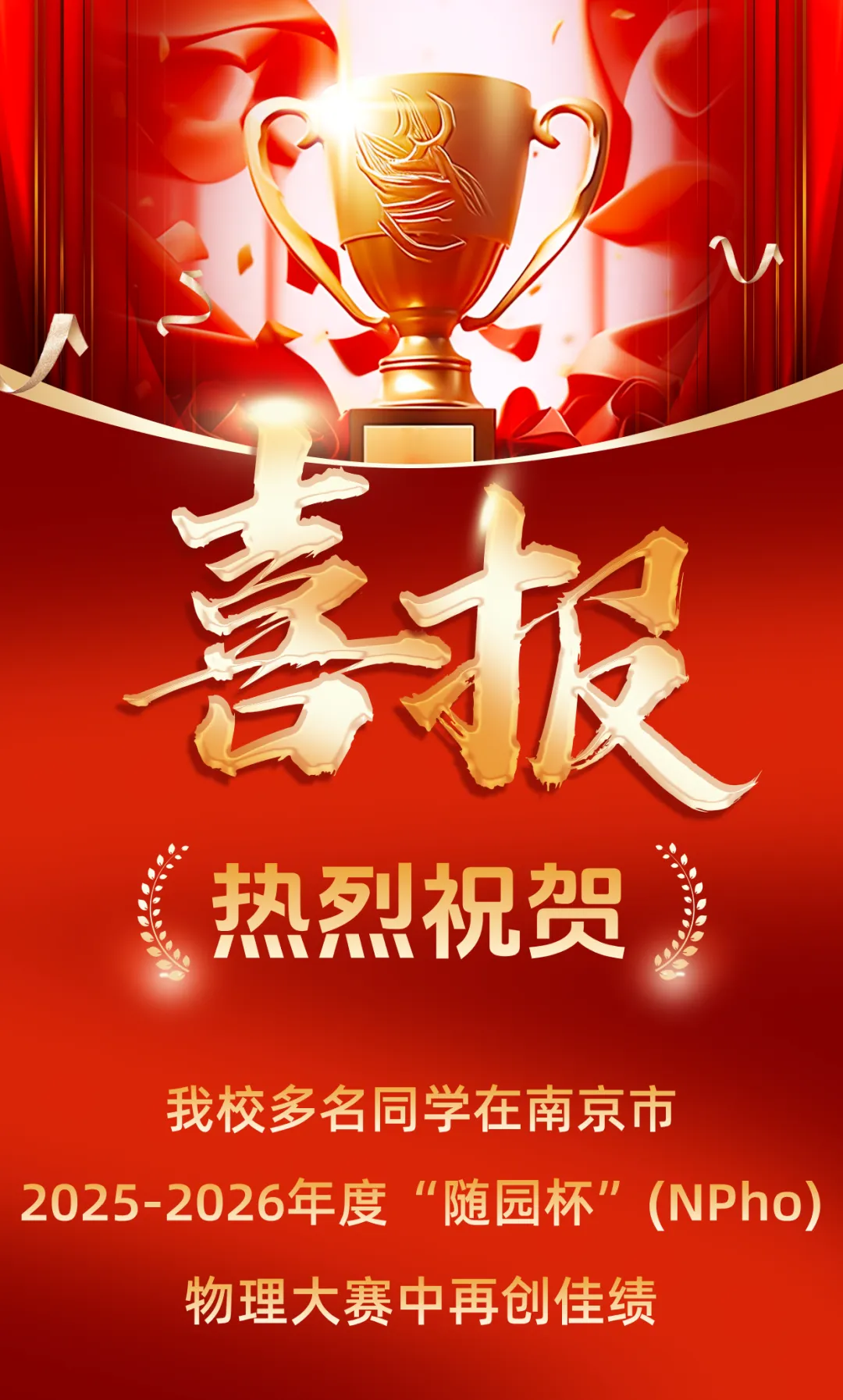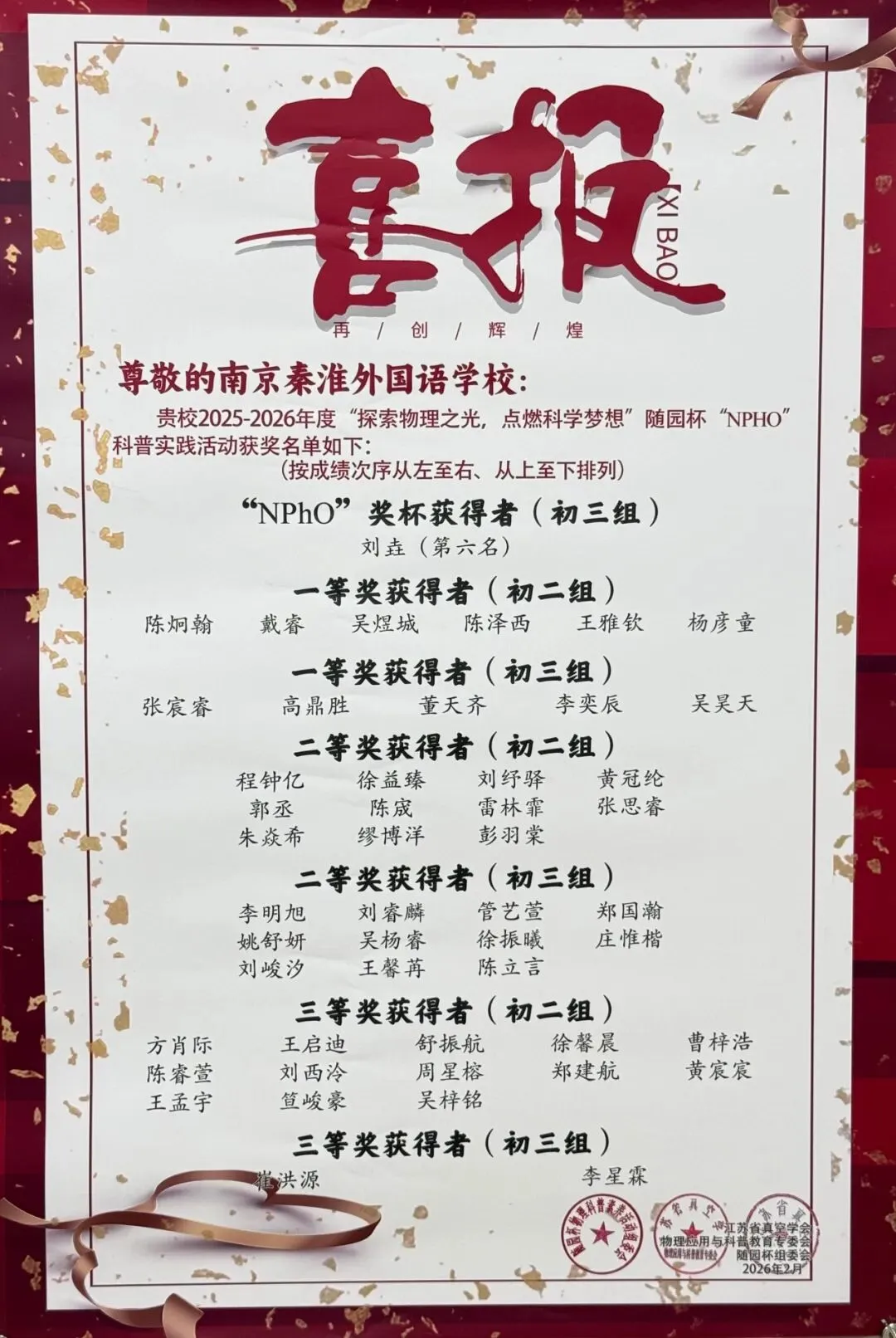 近日,由南京市物理学会主办的南京市“随园杯”物理学习兴趣与学习力测评大赛圆满落幕。我校学子沉着应战、奋勇争先,凭借扎实的学科功底和灵活的思维能力,斩获多项荣誉,再创佳绩!
